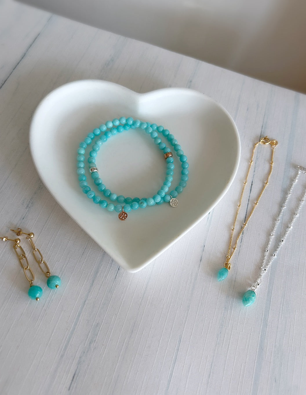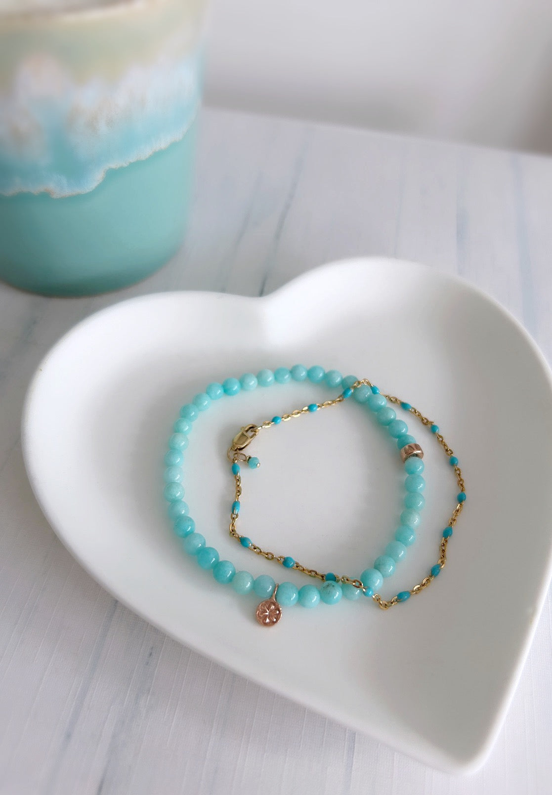 Pretty semi precious beaded Amazonite stacking bracelet with a dainty daisy charm in a choice of either a Sterling Silver or Rose Gold Vermeil finish hand threaded on a stretch cord.