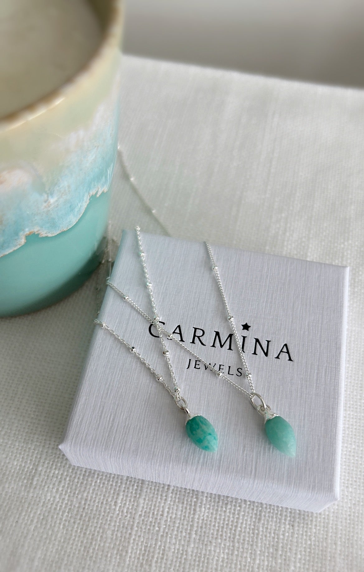 The necklace is available in a 16”, 18” or 20” length option and the Amazonite charm is 13mm.