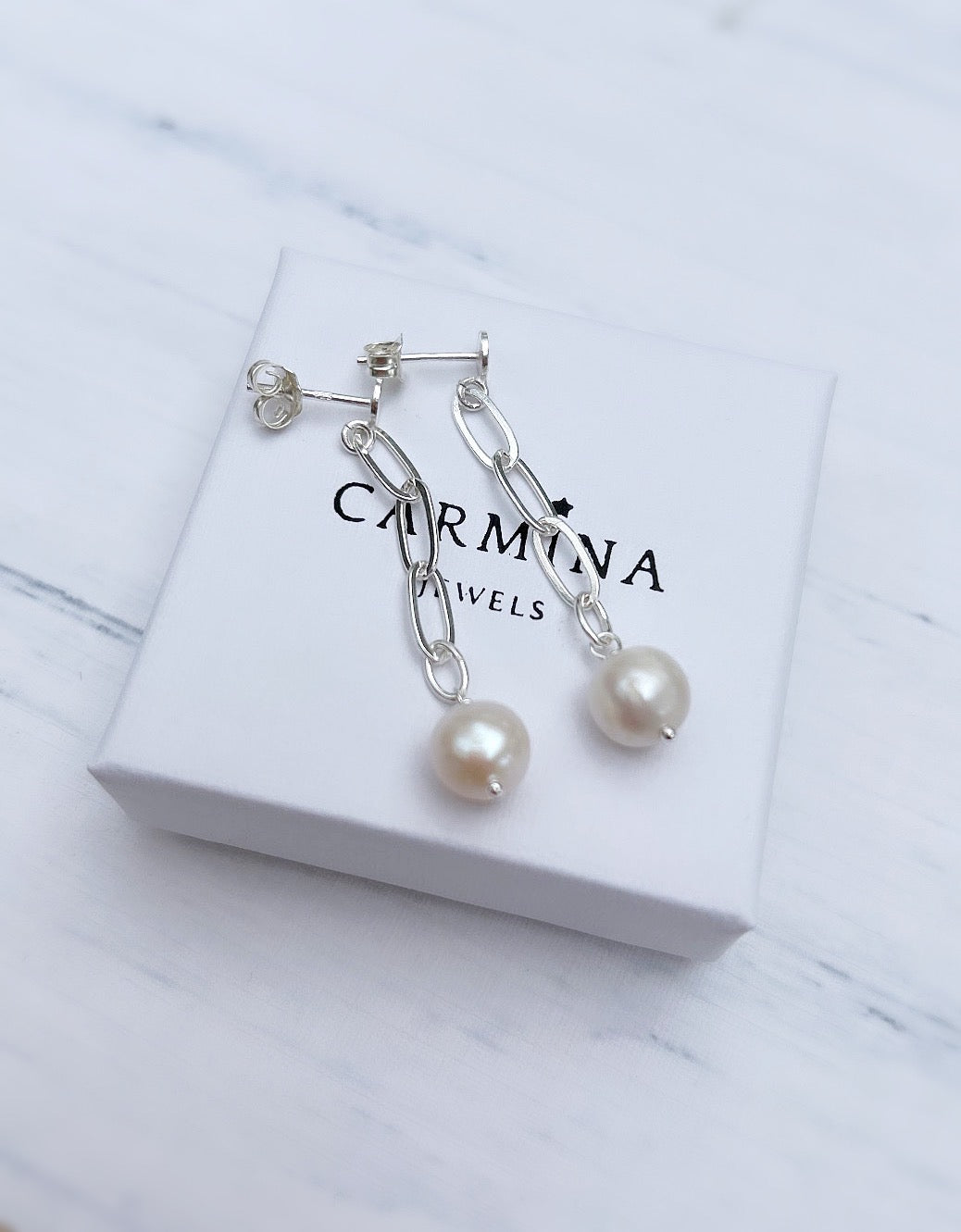 Gorgeous large link paperclip/cable chain dangle earrings with baroque Freshwater Pearls. The earrings are on a round flattened stud post with butterfly clasp fastenings ~ Available in a Sterling Silver or Gold filled finish and in a 3 link or 5 link drop/length.