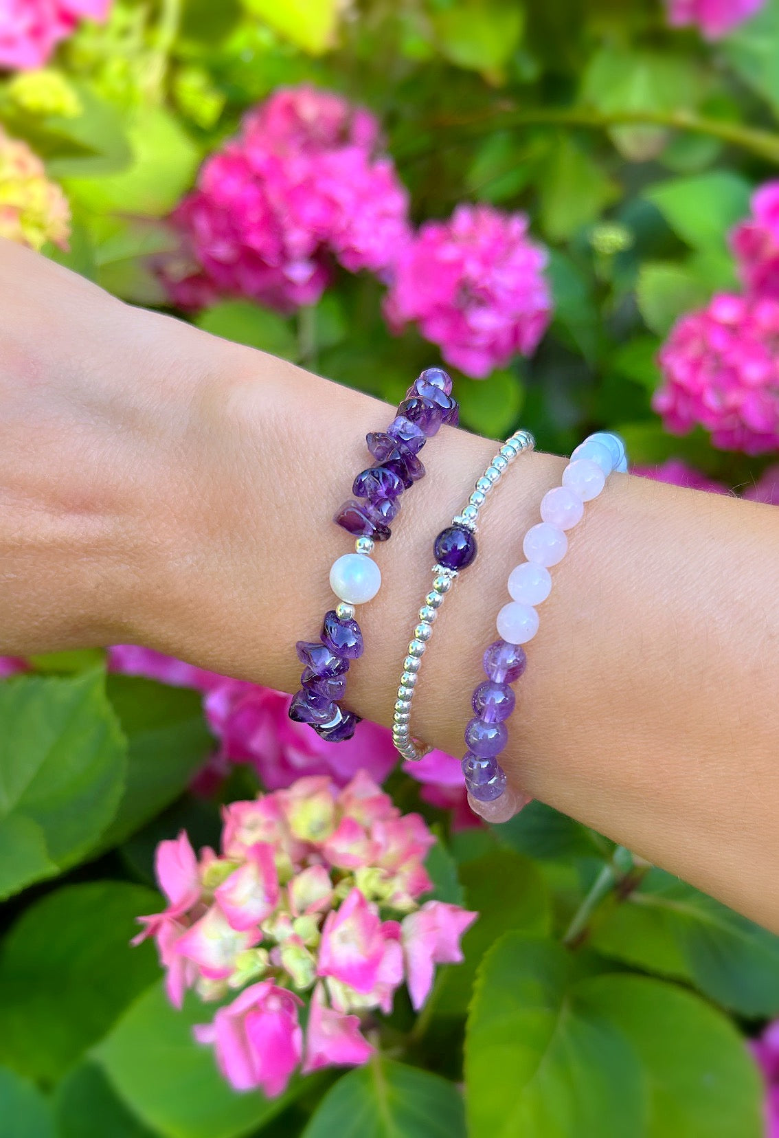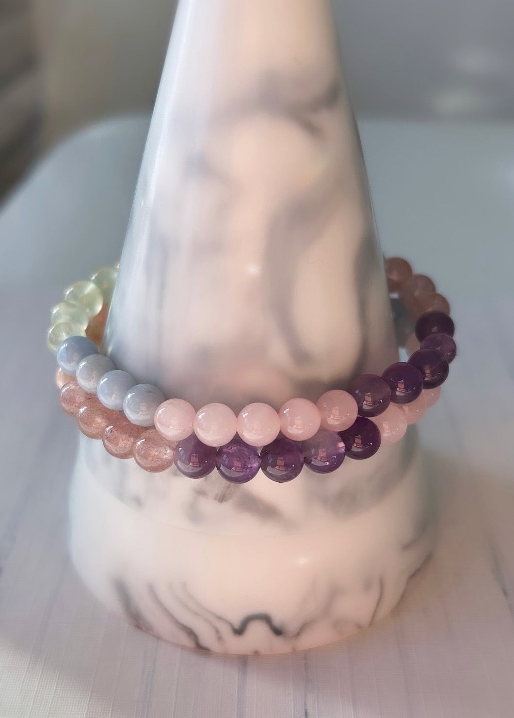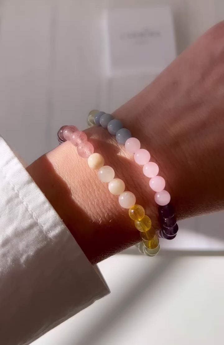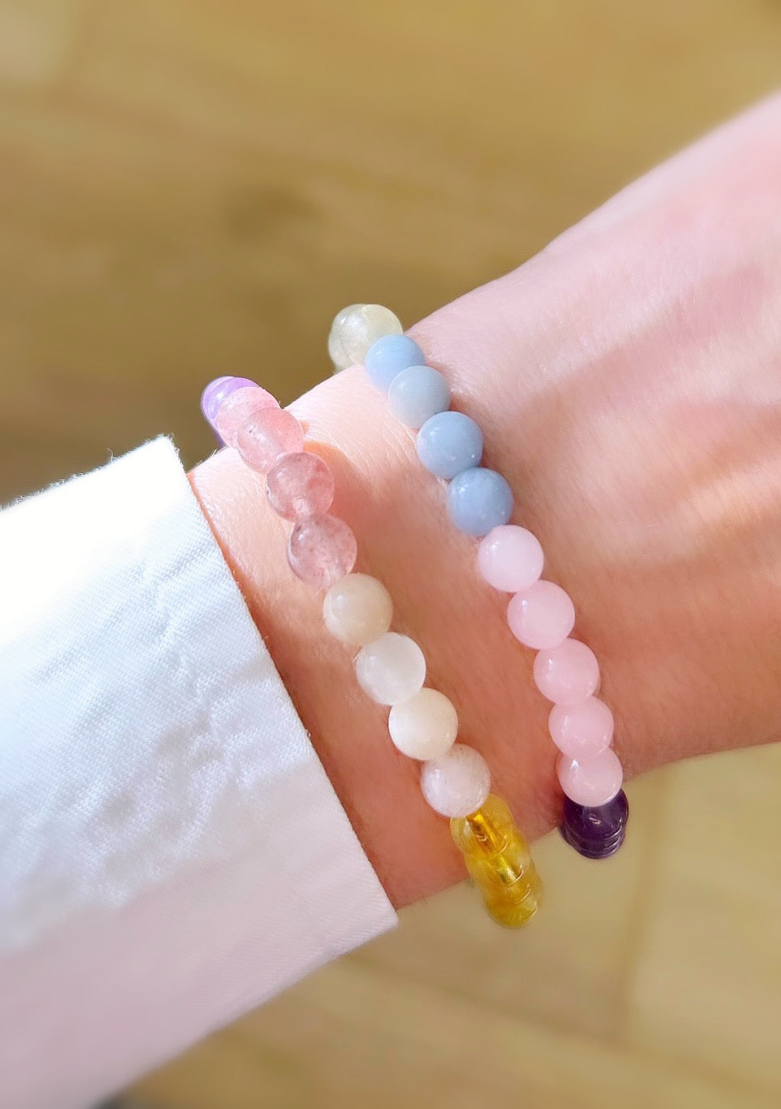 This Chakra semi precious beaded bracelet includes Amethyst, Rose Quartz, Angelite, Prehnite, Citrine, Peach Moonstone and Strawberry Quartz.