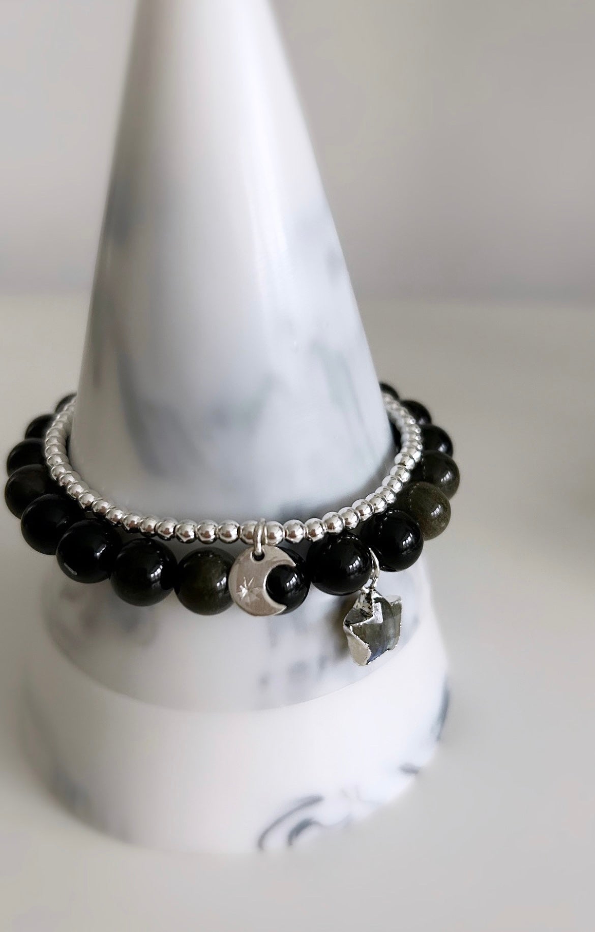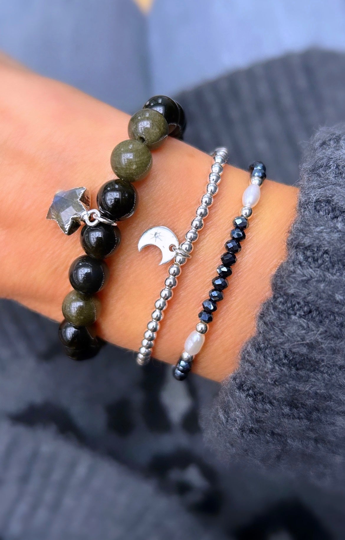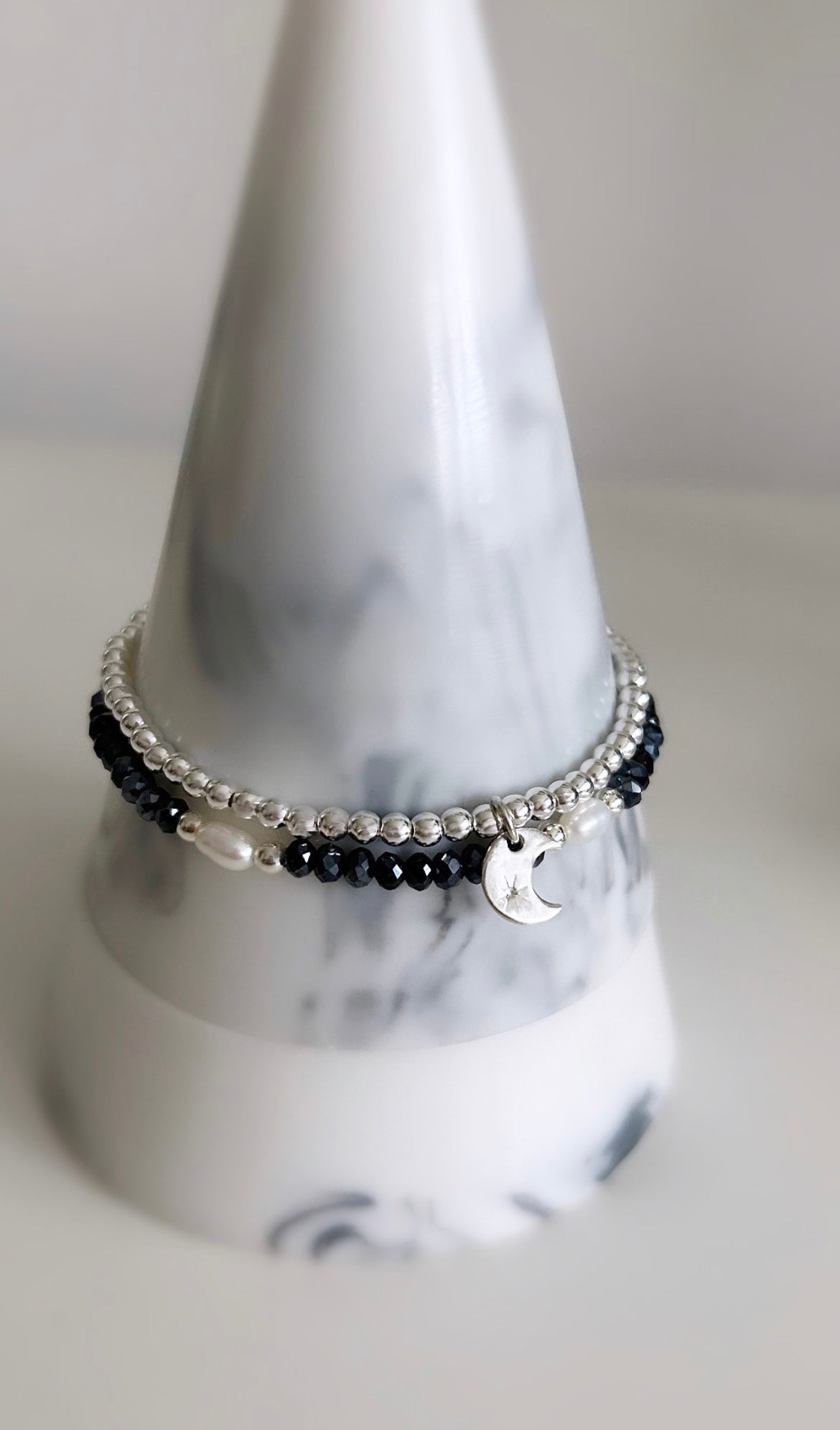 A sweet little beaded Crescent Moon charm bracelet in a choice of either a Sterling Silver or Gold finish. The bracelet is threaded on a high quality stretch cord ~ a perfect stacking bracelet!