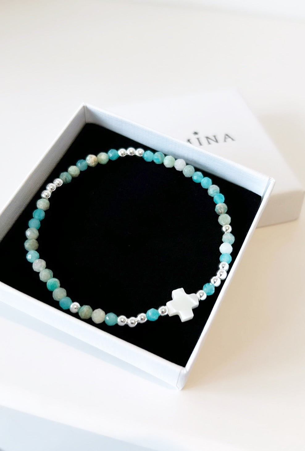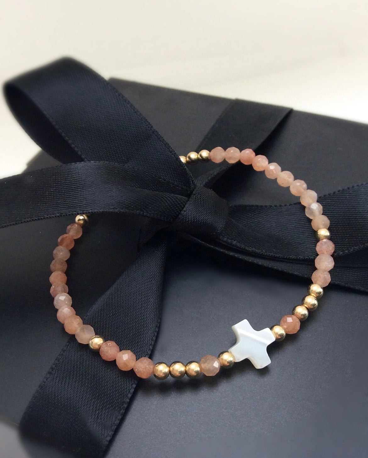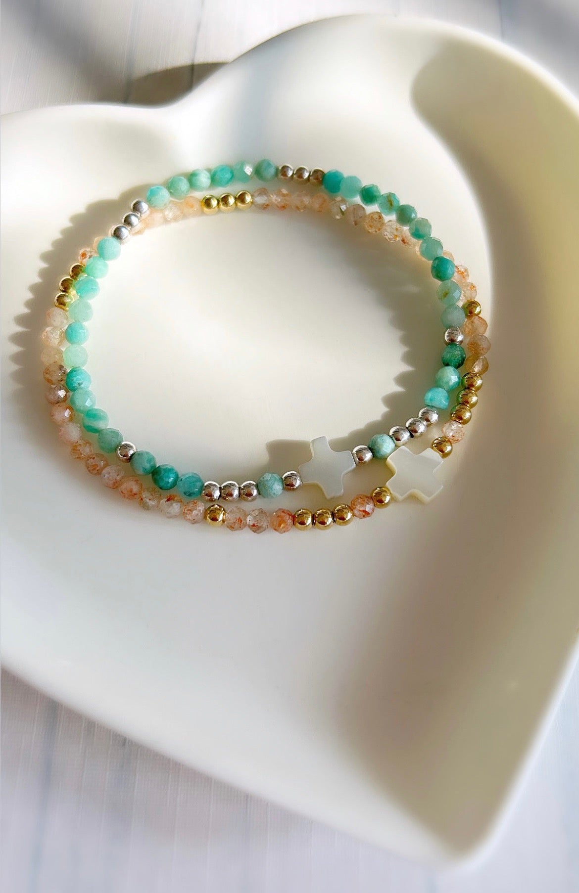 Gorgeous Greek Mother of Pearl Cross bracelets, in either Amazonite or Sunstone Semi-precious faceted beads.