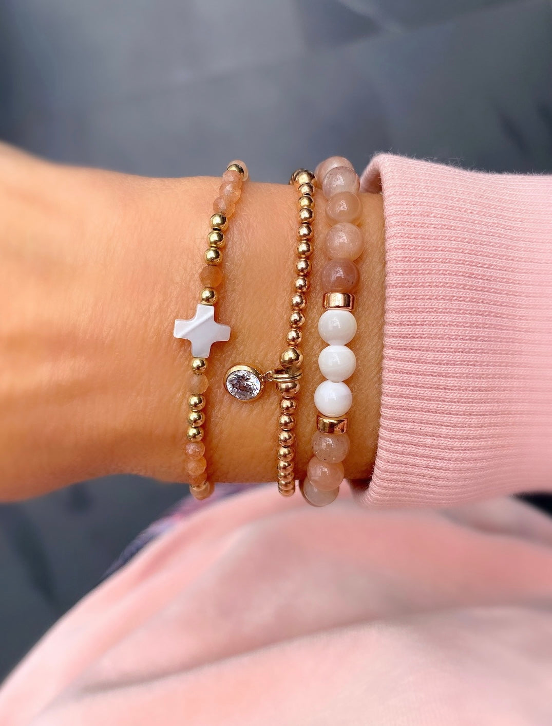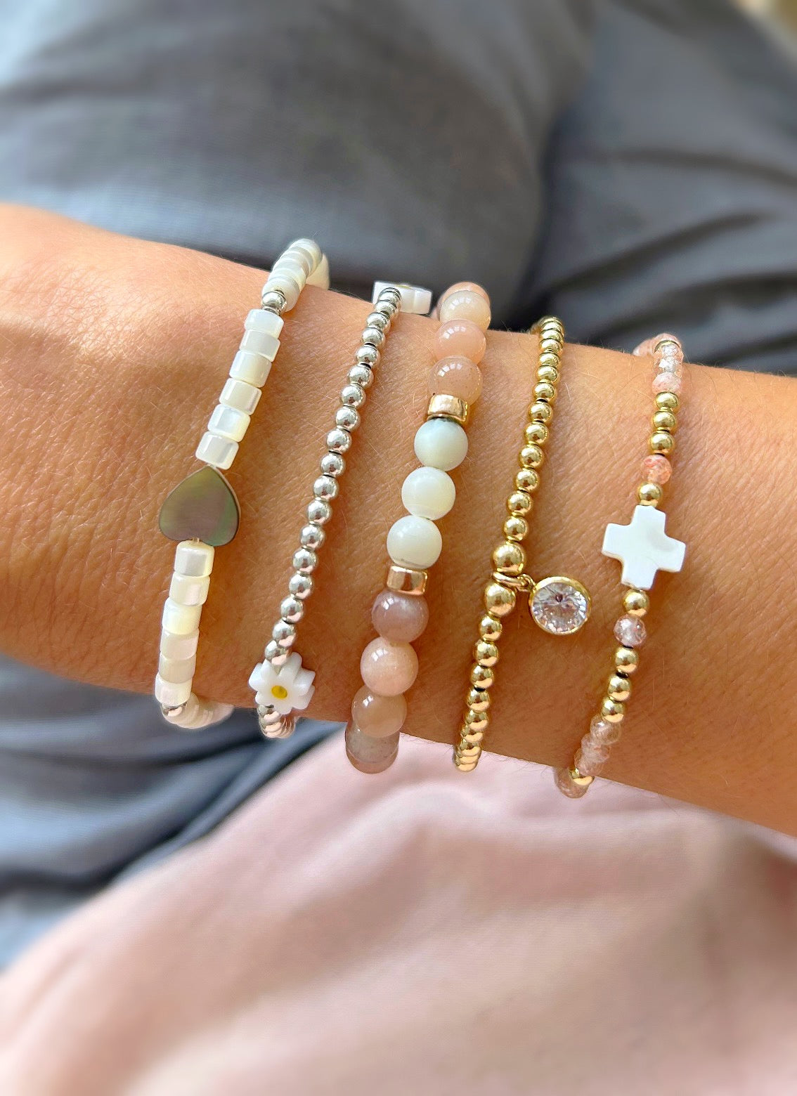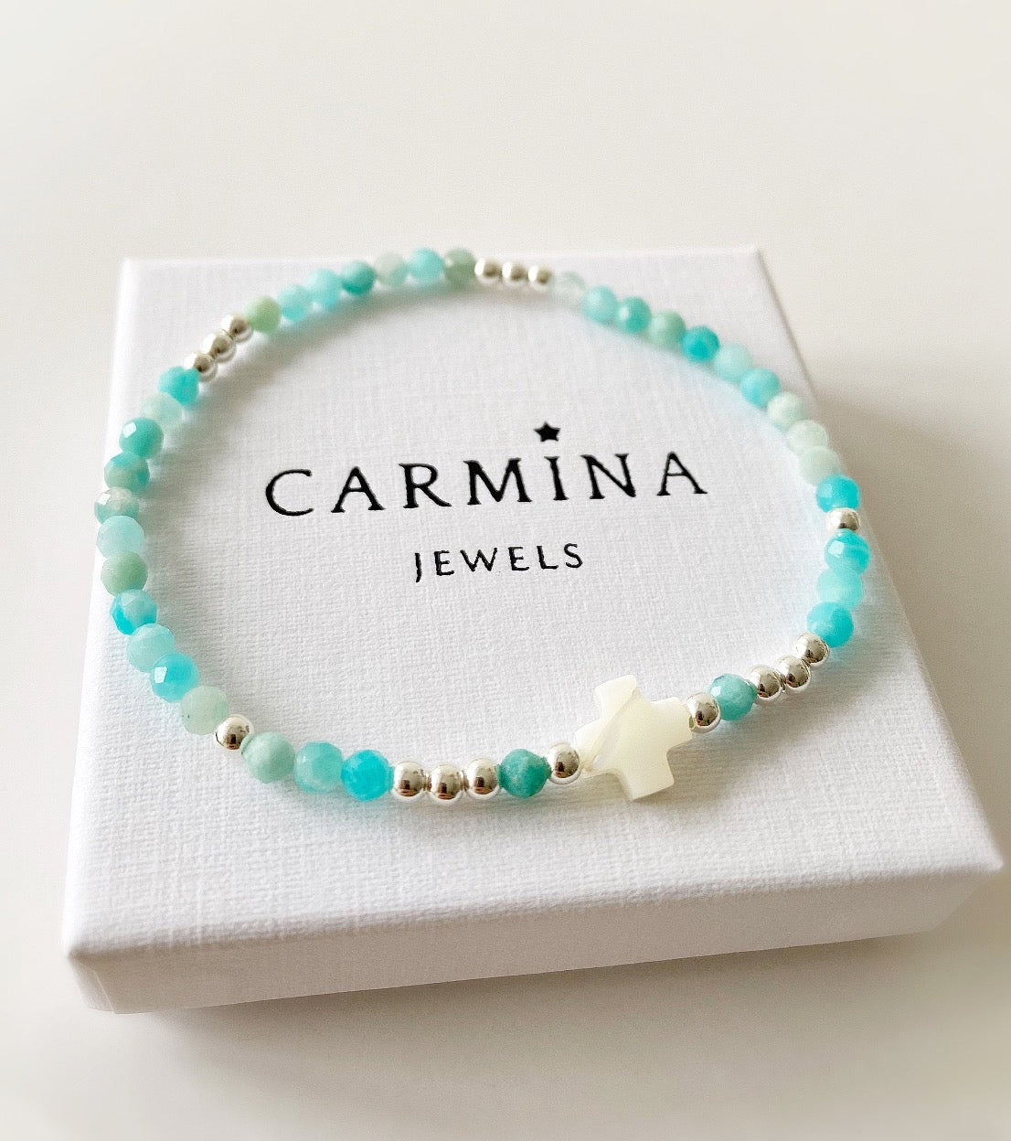 Gorgeous Greek Mother of Pearl Cross bracelets, in either Amazonite or Sunstone Semi-precious faceted beads.