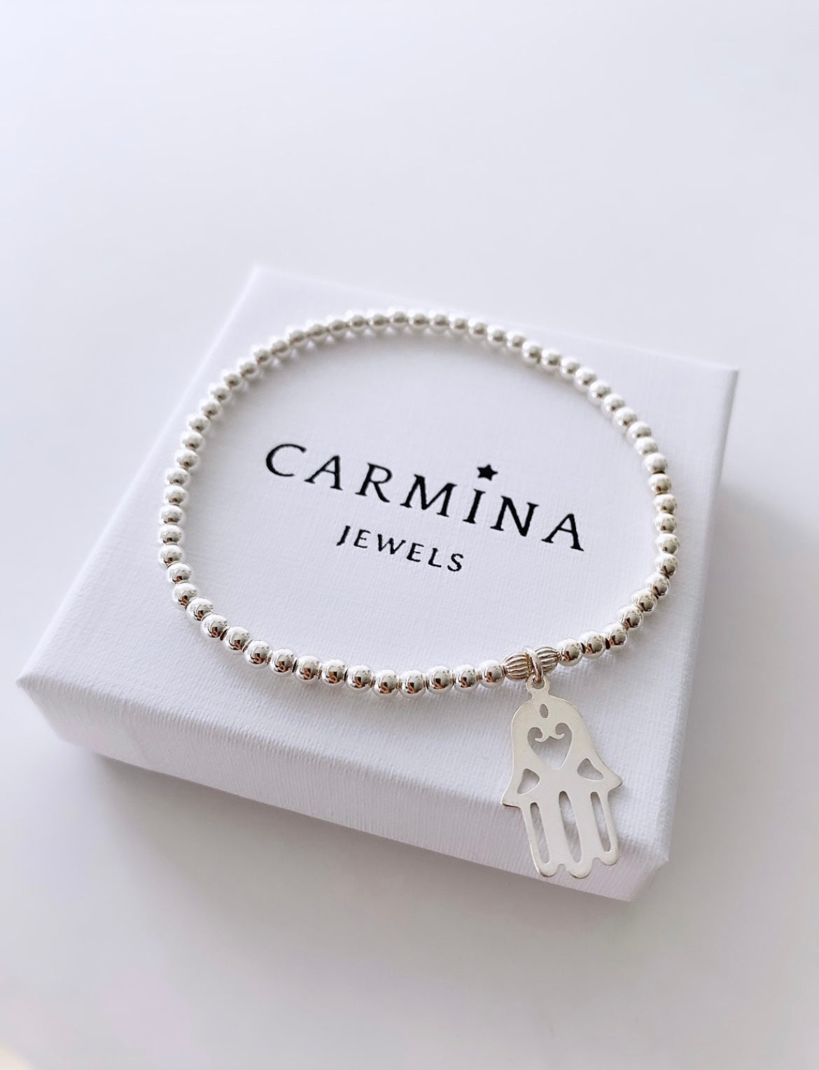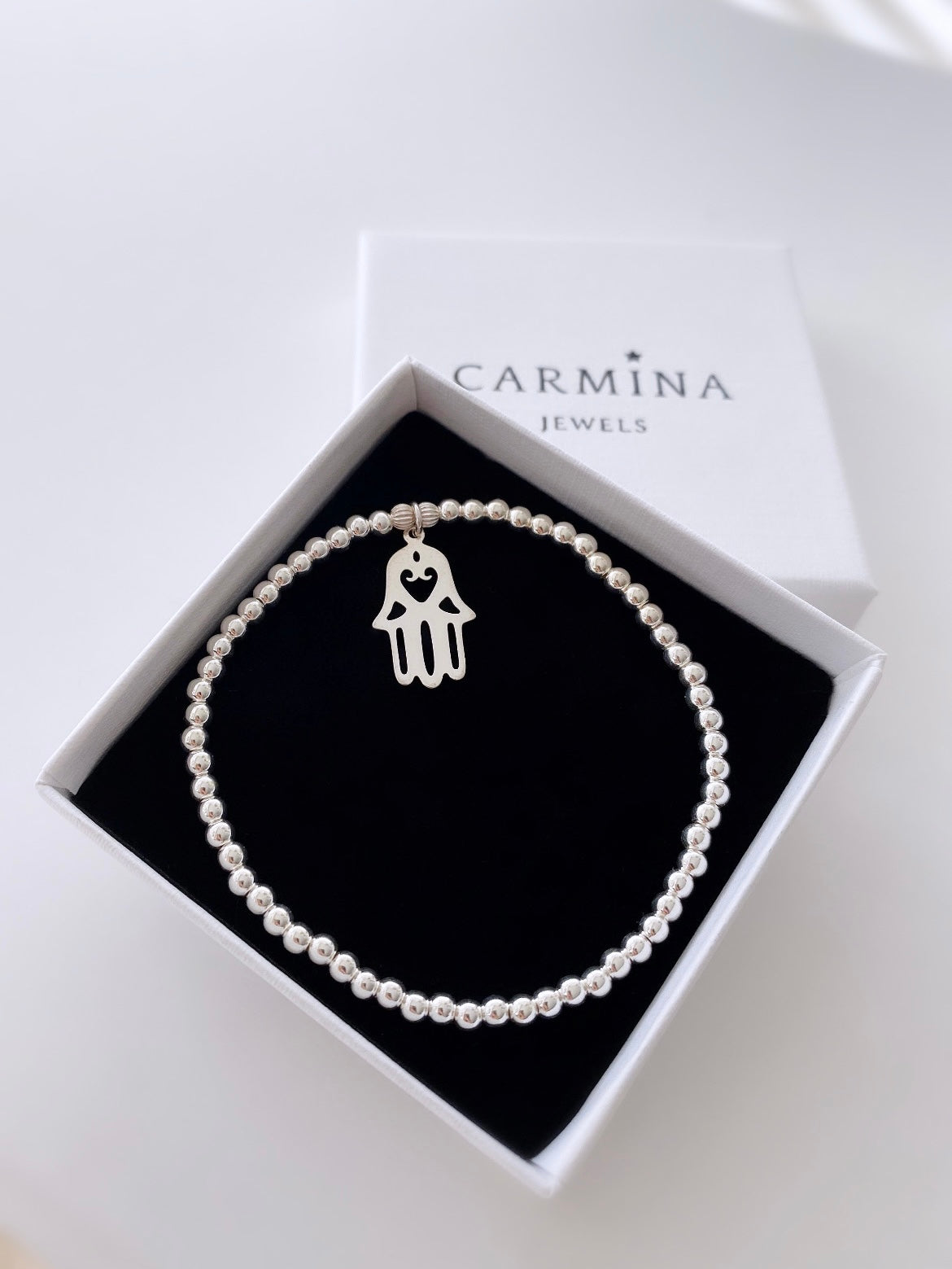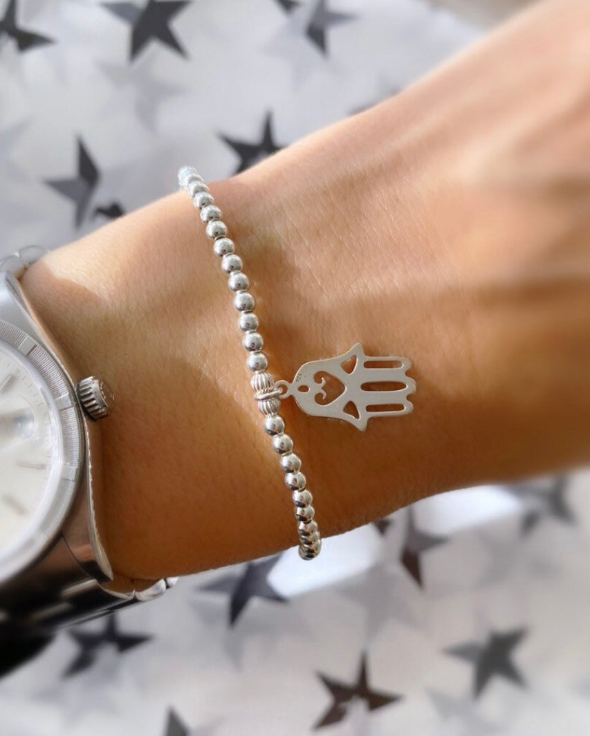 Beautiful Sterling Silver beaded bracelet on a stretch cord with a silver Hamsa charm.