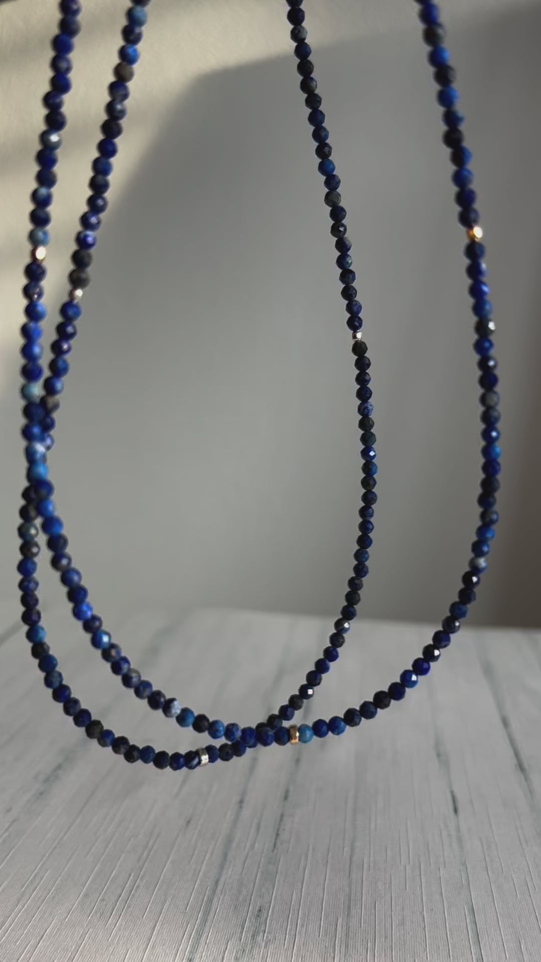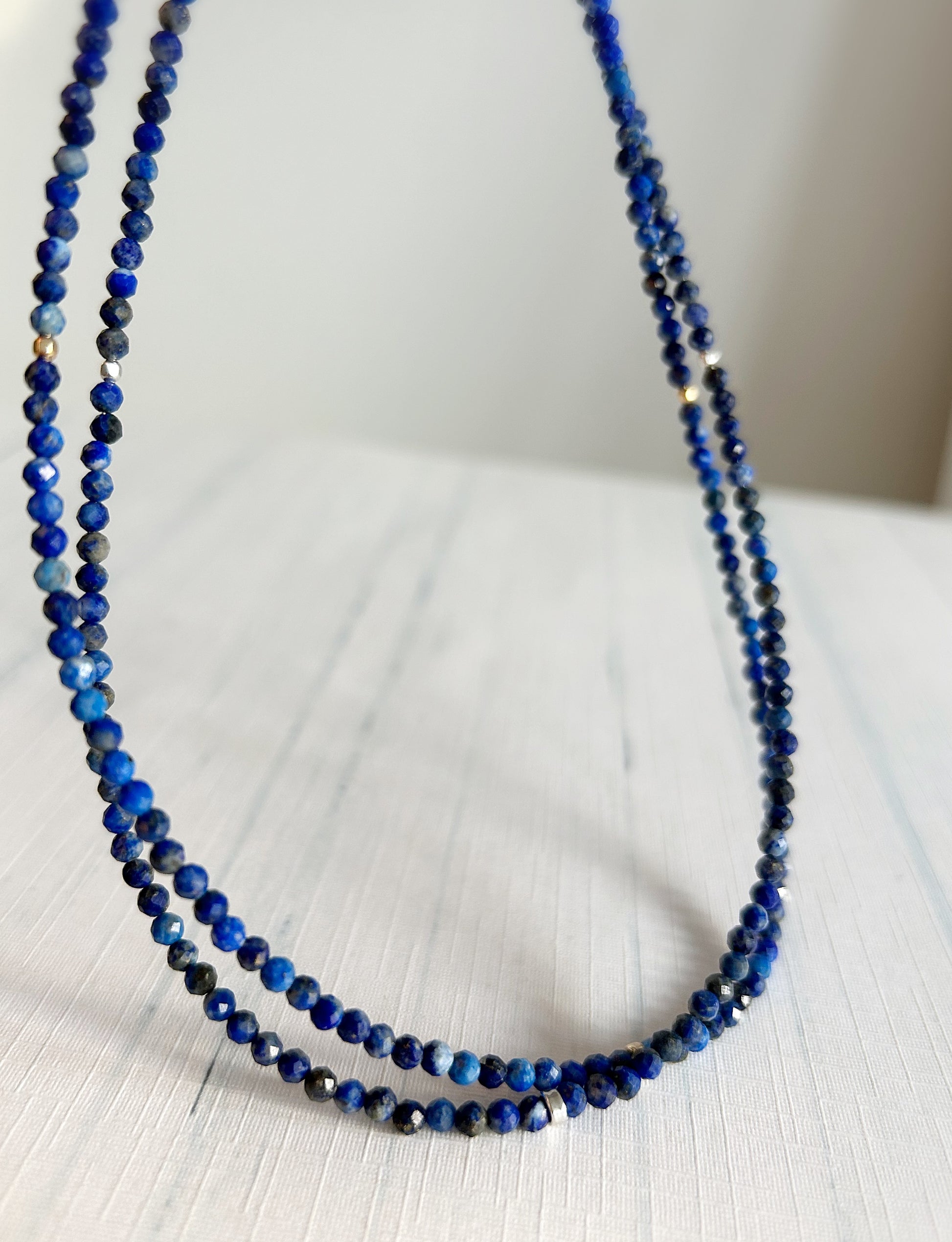 Beautiful Lapis Lazuli semi precious faceted bead necklace. This delicate necklace comes in a choice of two finishes using either Sterling Silver or Gold Filled spacer beads and lobster closure clasp.