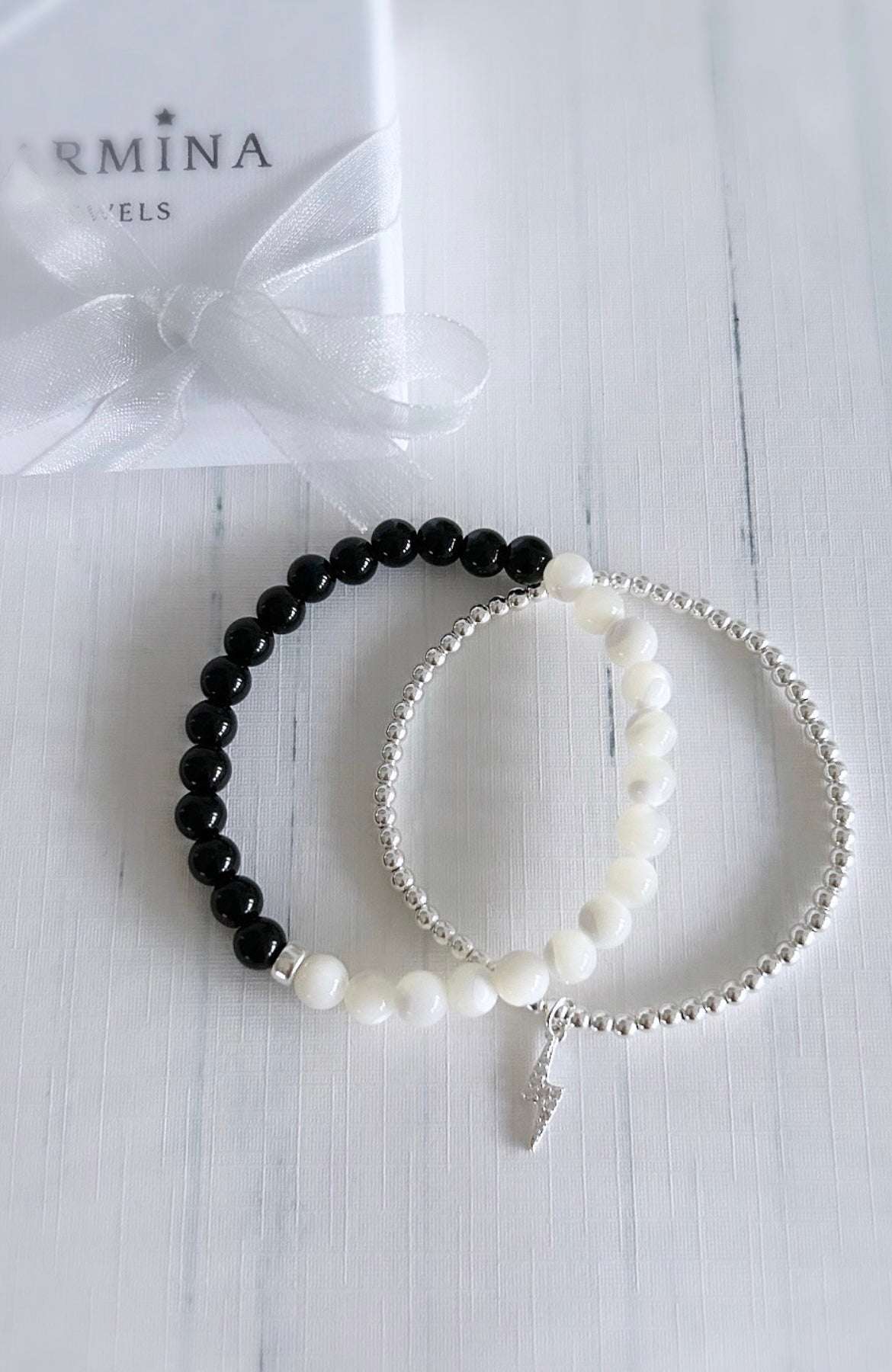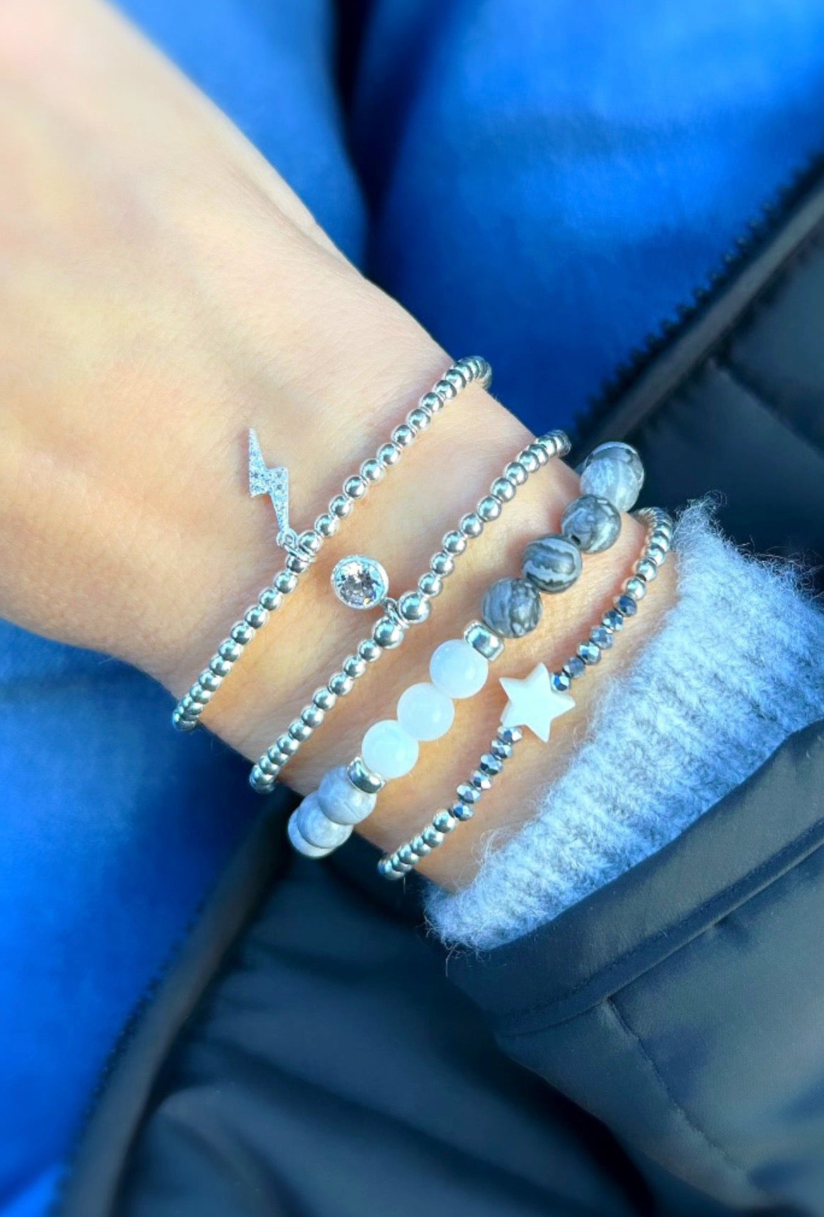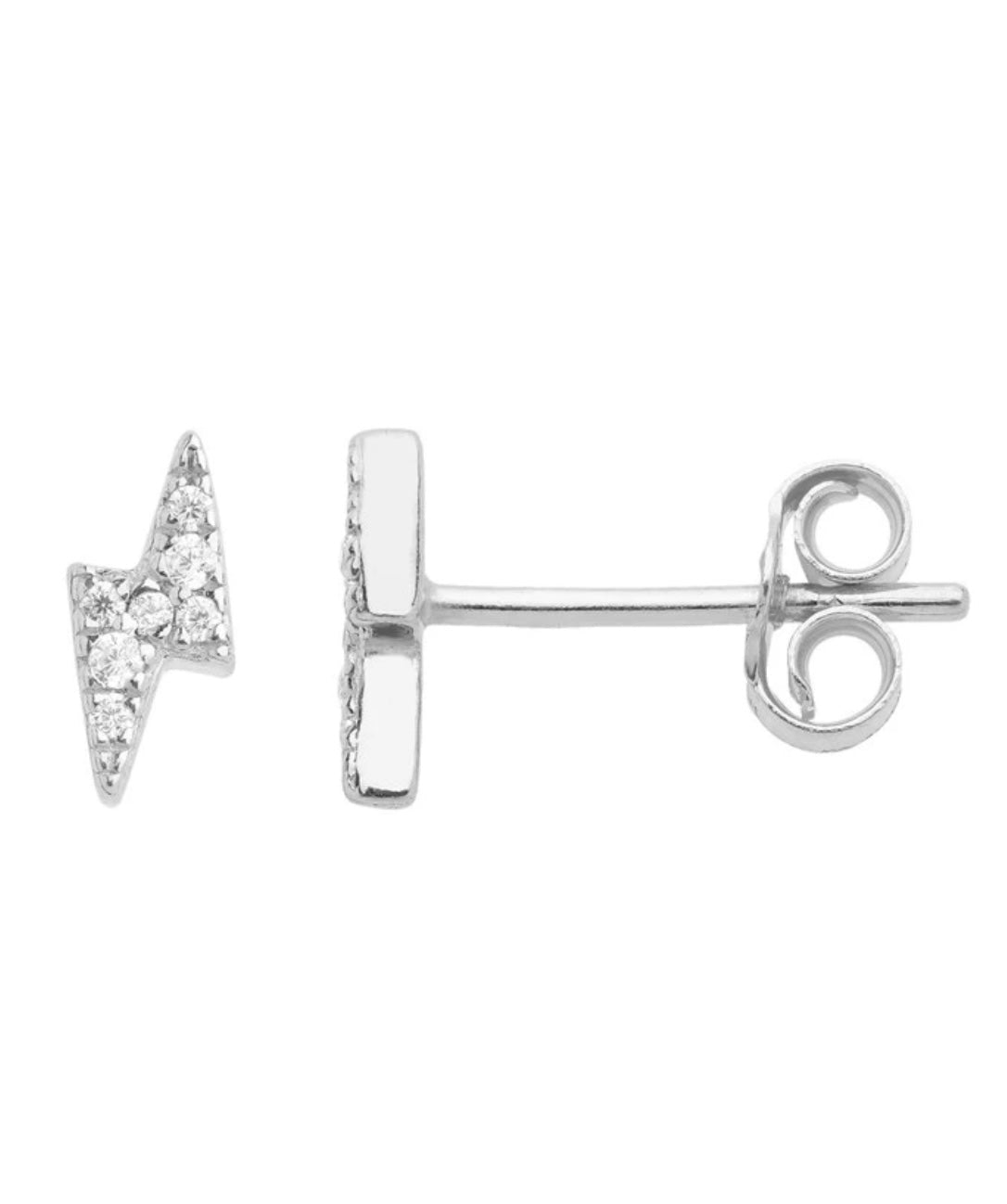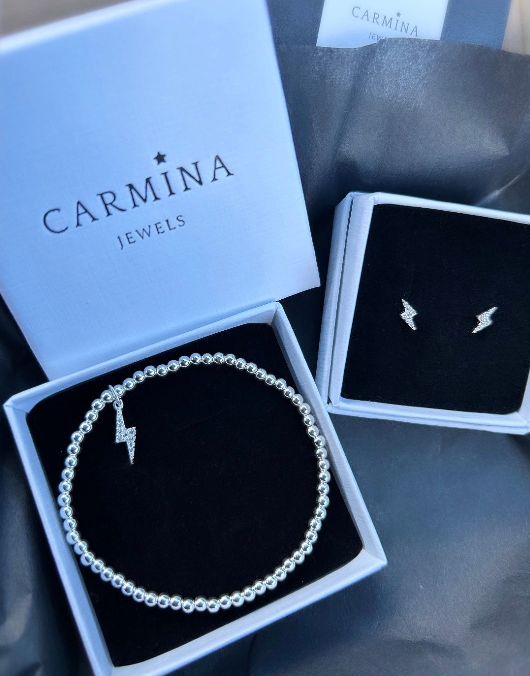 A sparkling CZ encrusted lightning bolt charm bracelet in Sterling Silver, to match with the lightning bolt stud earrings. The bracelet is threaded on a high quality stretch cord ~ a perfect stacking bracelet & ideal matching gift set!