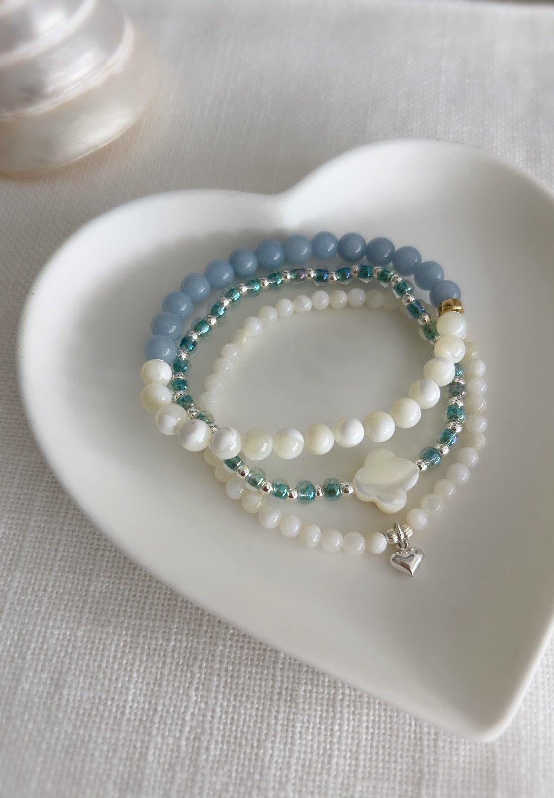 A gorgeous Mother of Pearl clover charm bracelet with Sterling silver and sea blue lined crystal glass miyuki beads on a strong stretch cord - a perfect summer stacker.