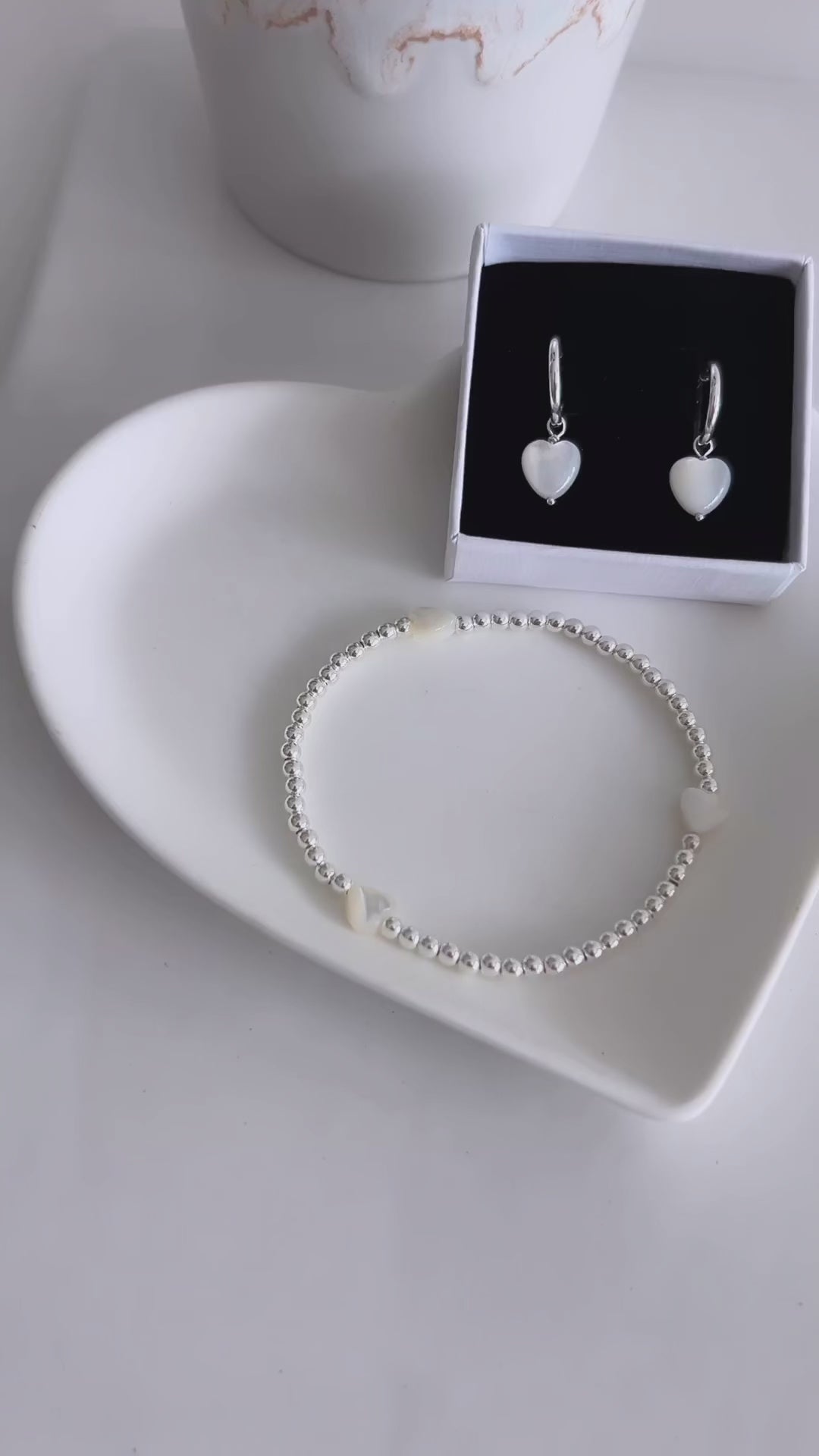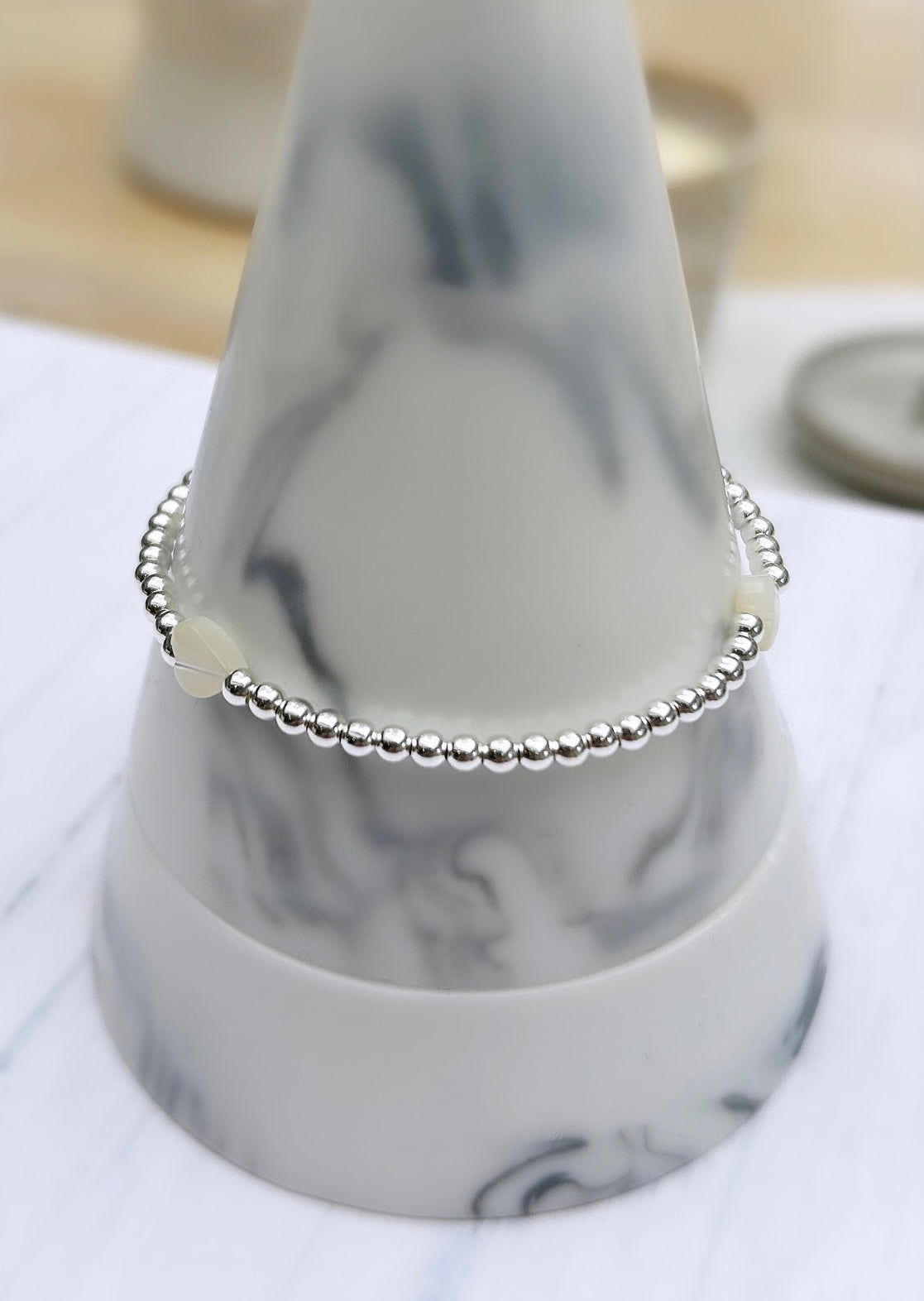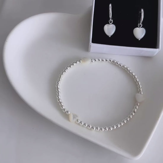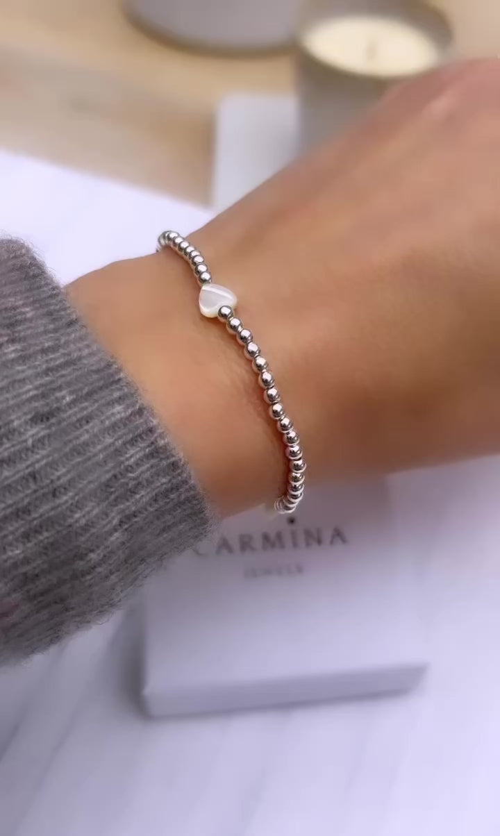 Pretty Mother of Pearl heart bracelet with Sterling Silver 3mm beads hand threaded on a high quality stretch cord. These cute bracelets look great worn stacked!