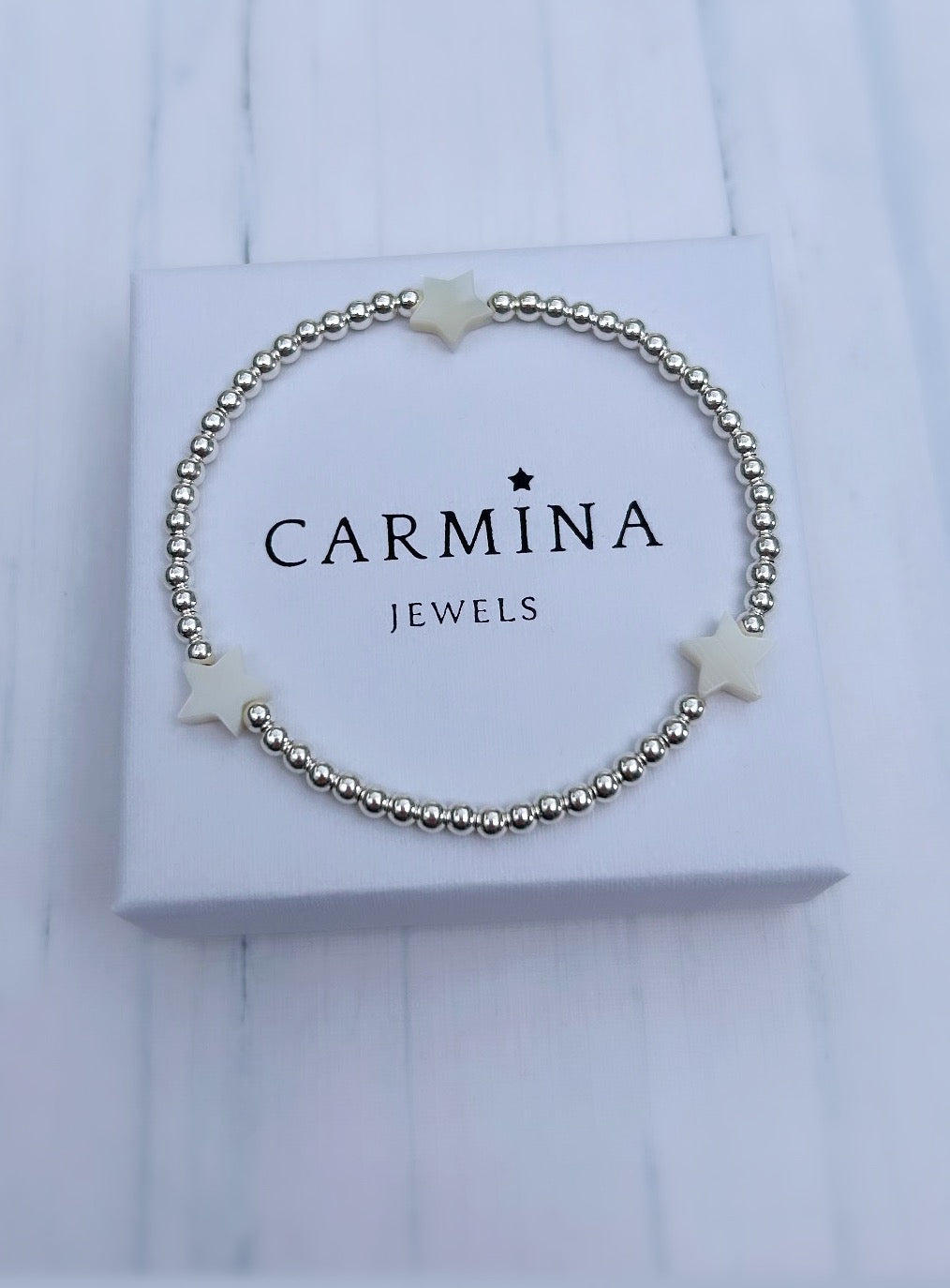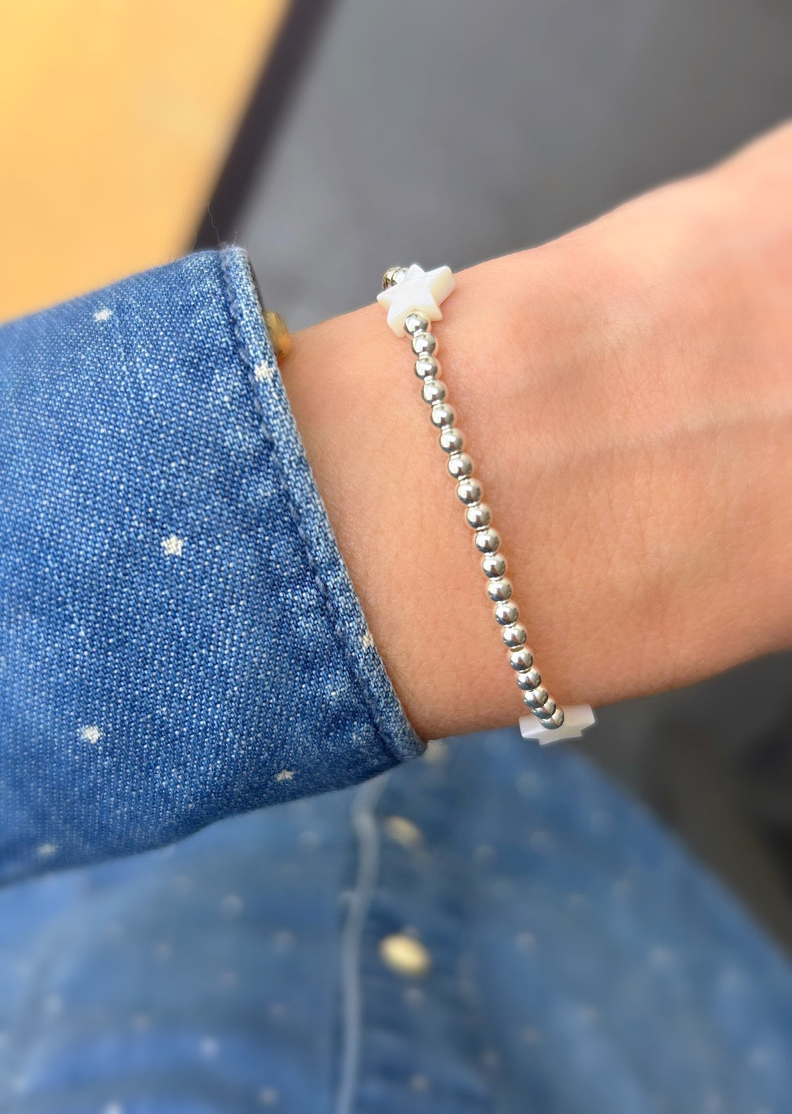 Pretty Mother of Pearl Star bracelet with Sterling Silver 3mm beads, hand threaded on high quality jewellery elastic for a comfortable stretch fit. These sweet bracelets look great worn stacked!