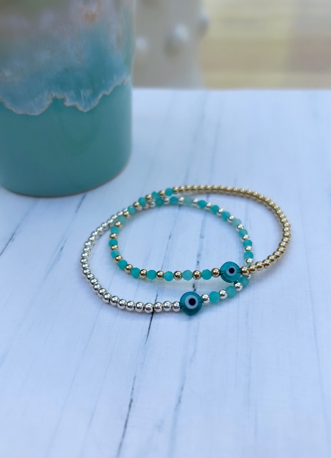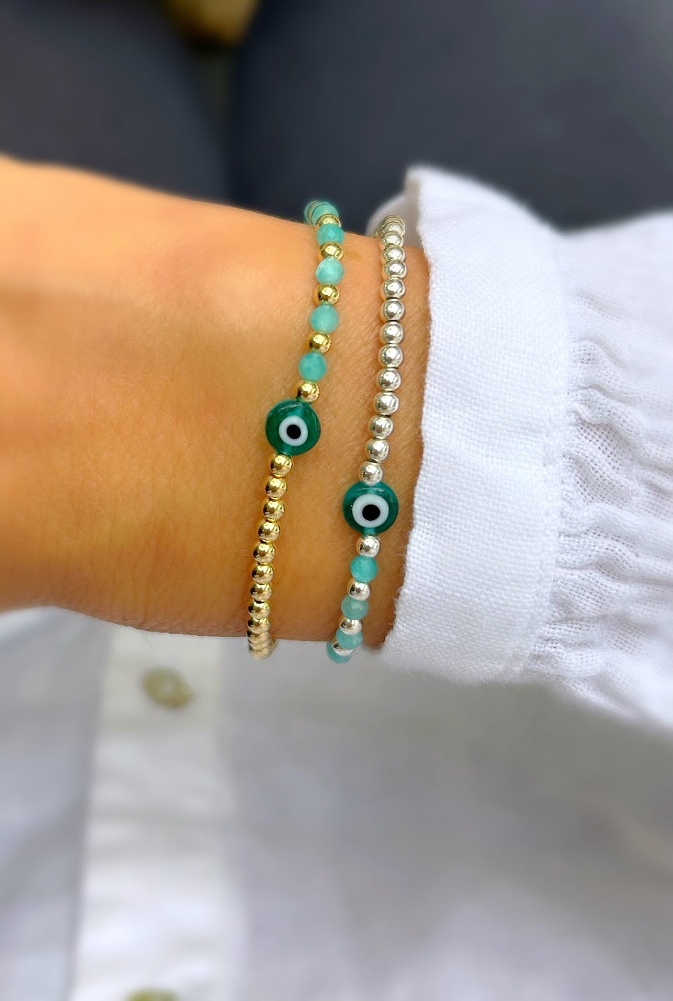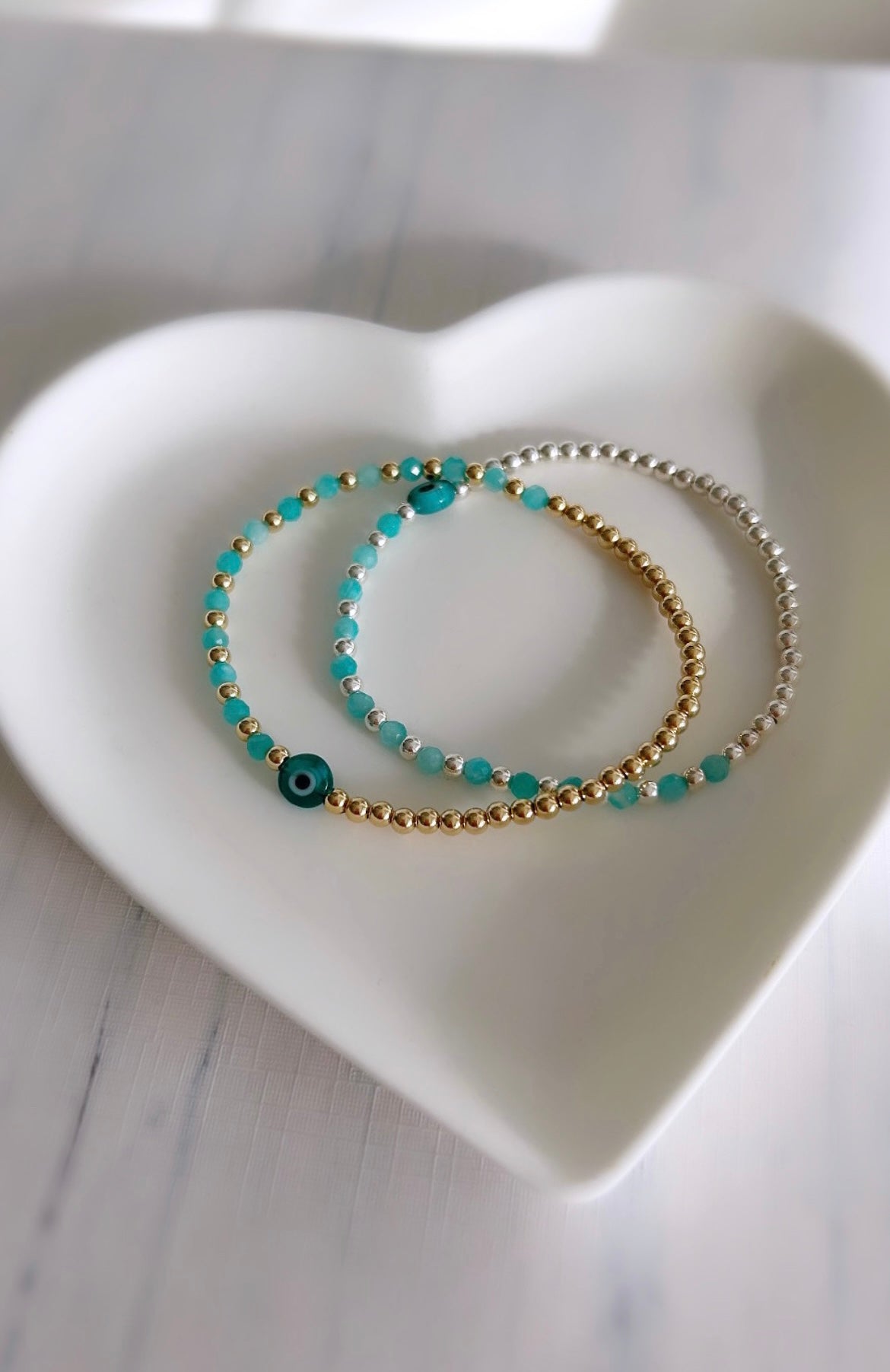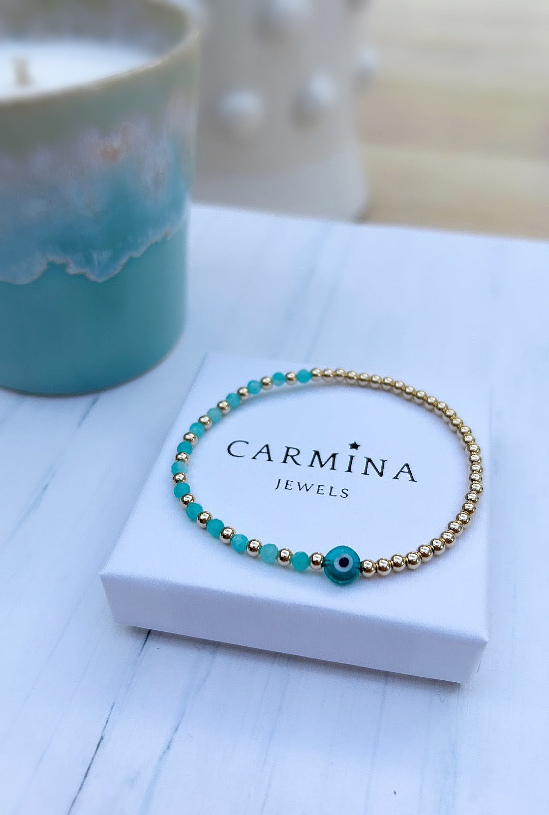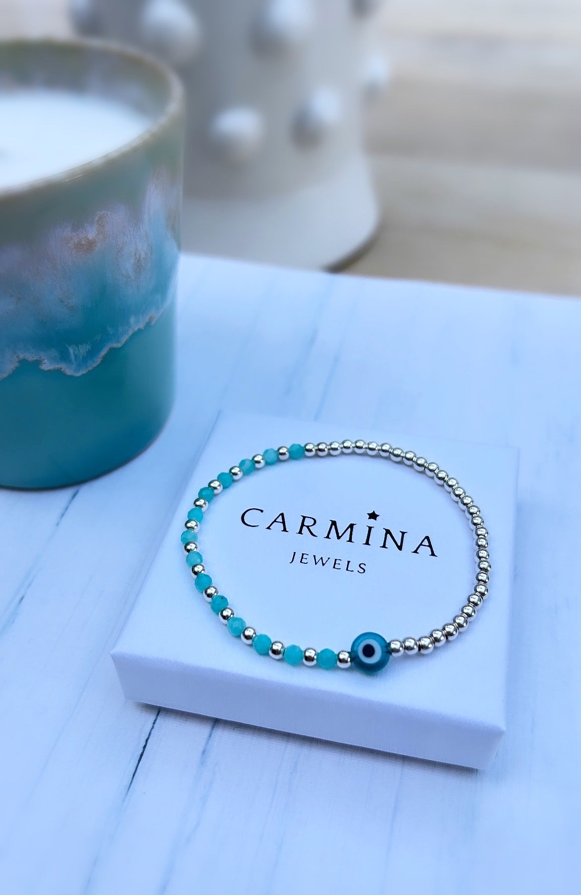Pretty handmade Murano glass lucky ‘evil’ eye charm bracelet with Amazonite glass crystal beads, either in a Sterling Silver or Gold Filled finish. The bracelets are hand threaded on a high quality stretch cord.
