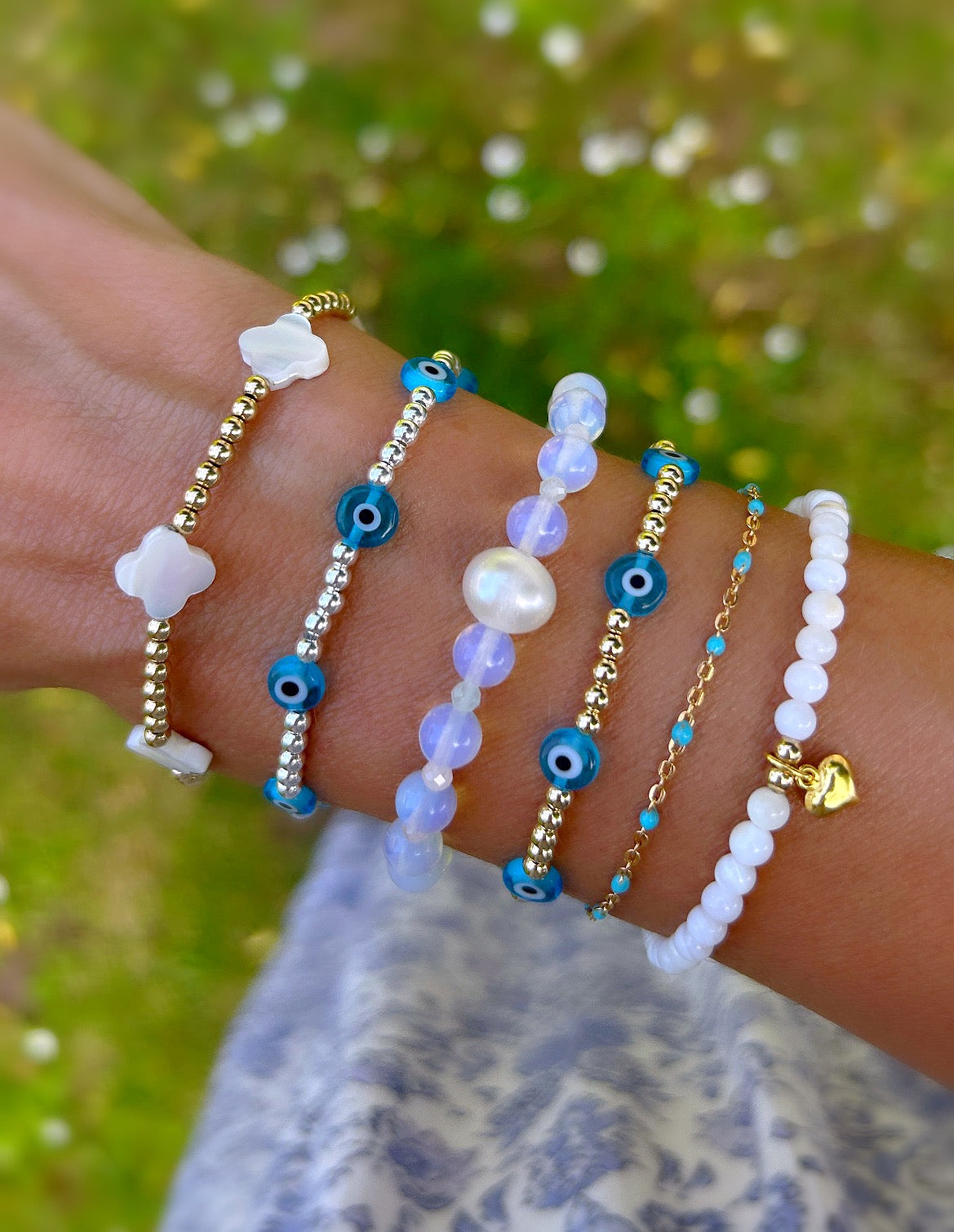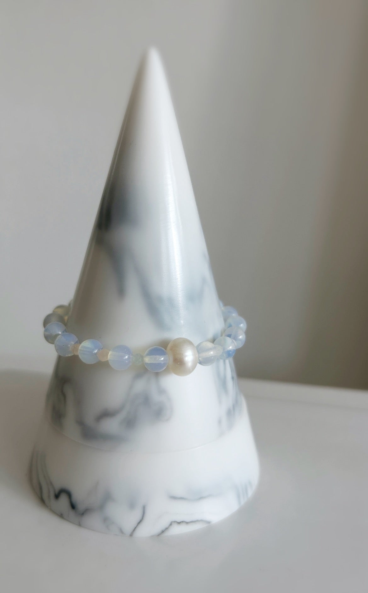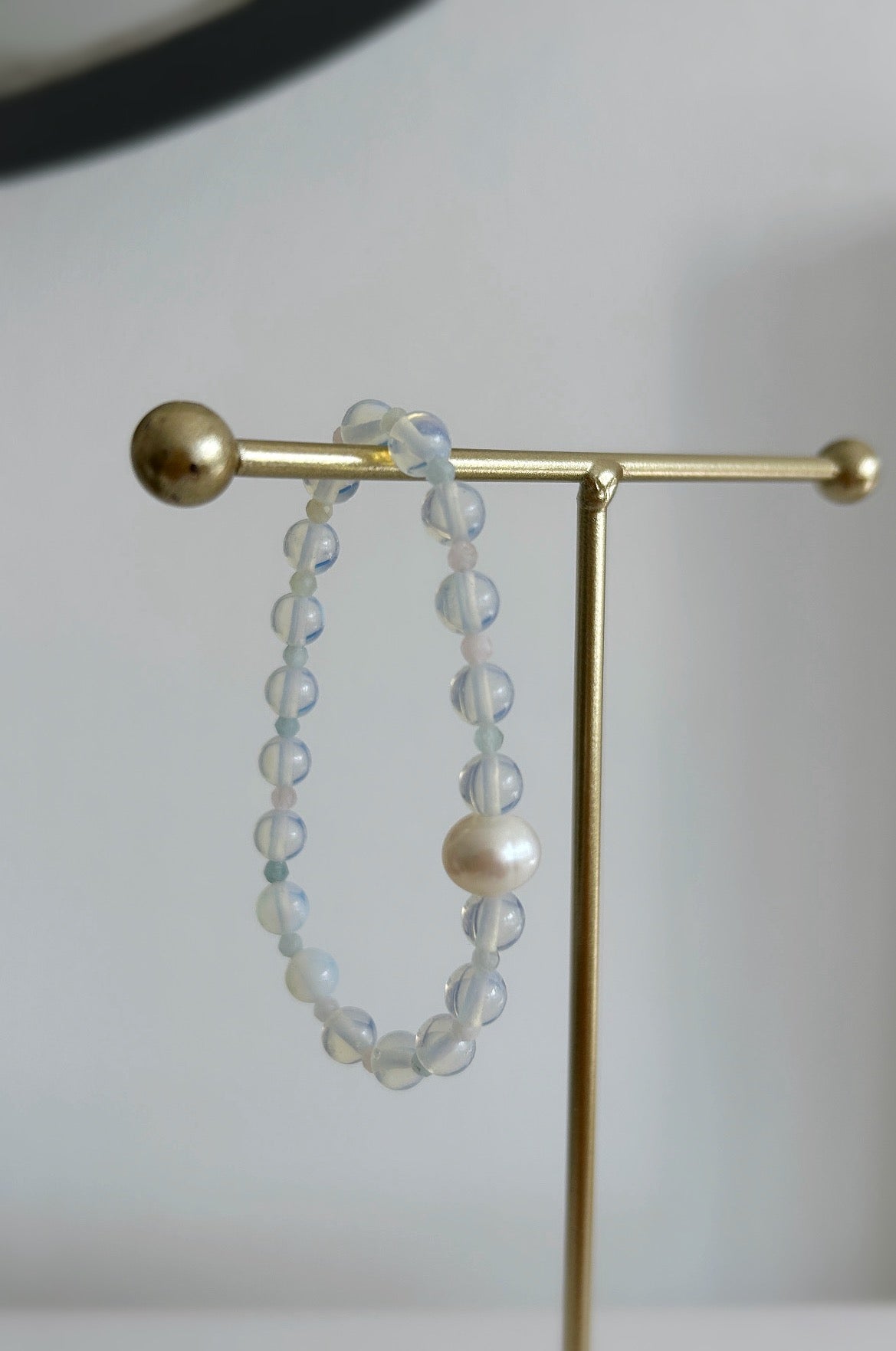 A iridescent Opalite glass beaded bracelet, featuring a single large Freshwater pearl and faceted semi-precious Morganite crystals delicately spaced throughout. The soft pink and blue tones of the Morganite beautifully enhance the glow of the Opalite, creating a pretty, feminine look.