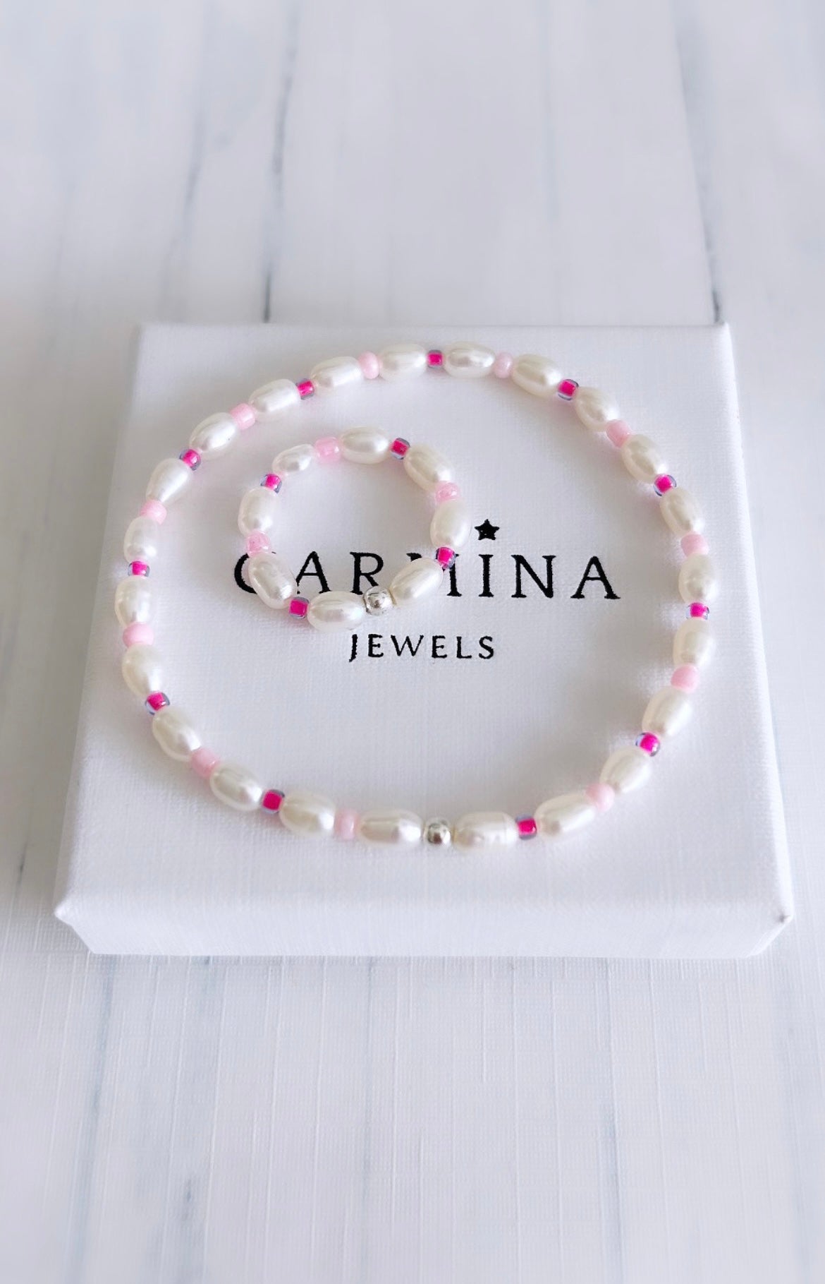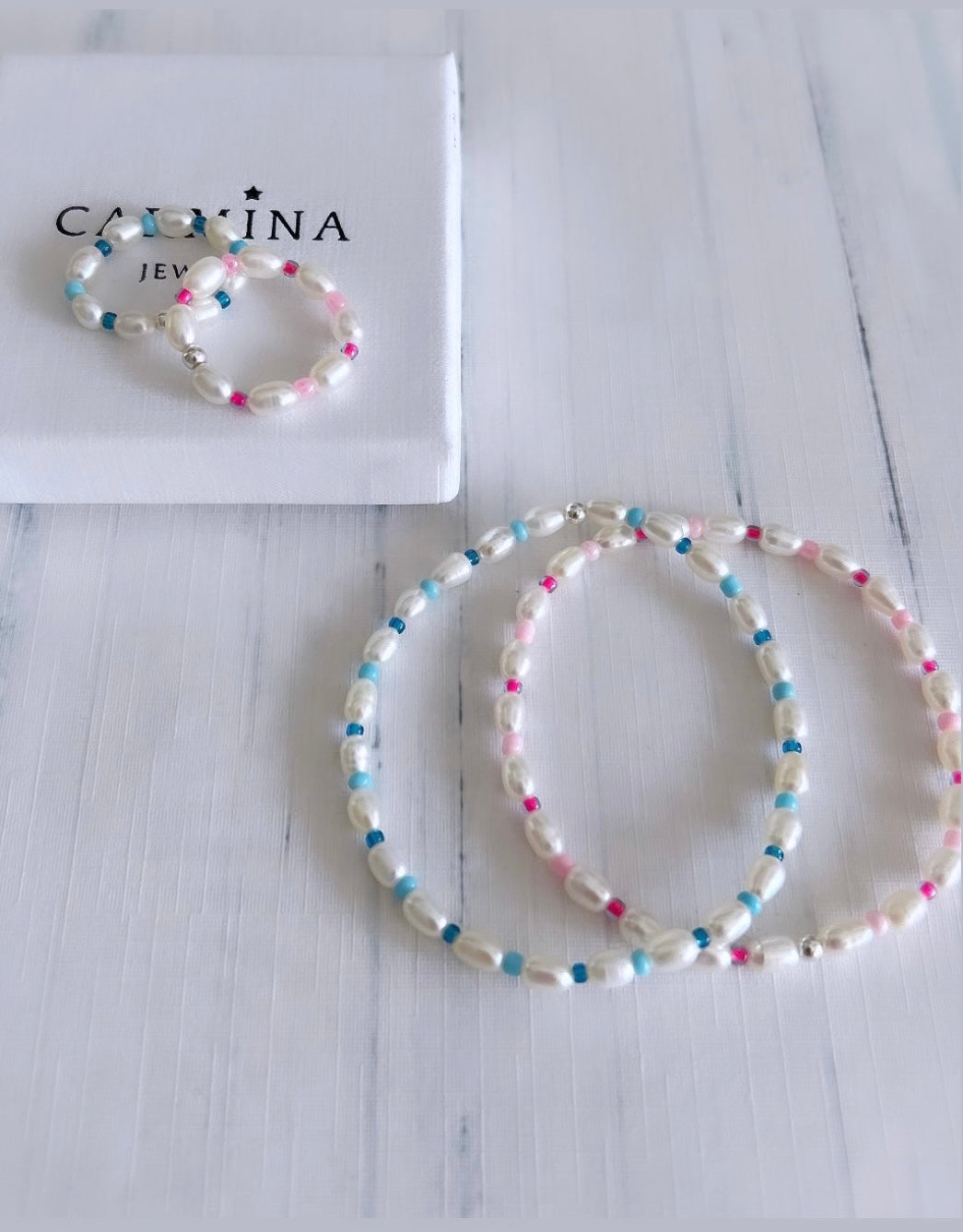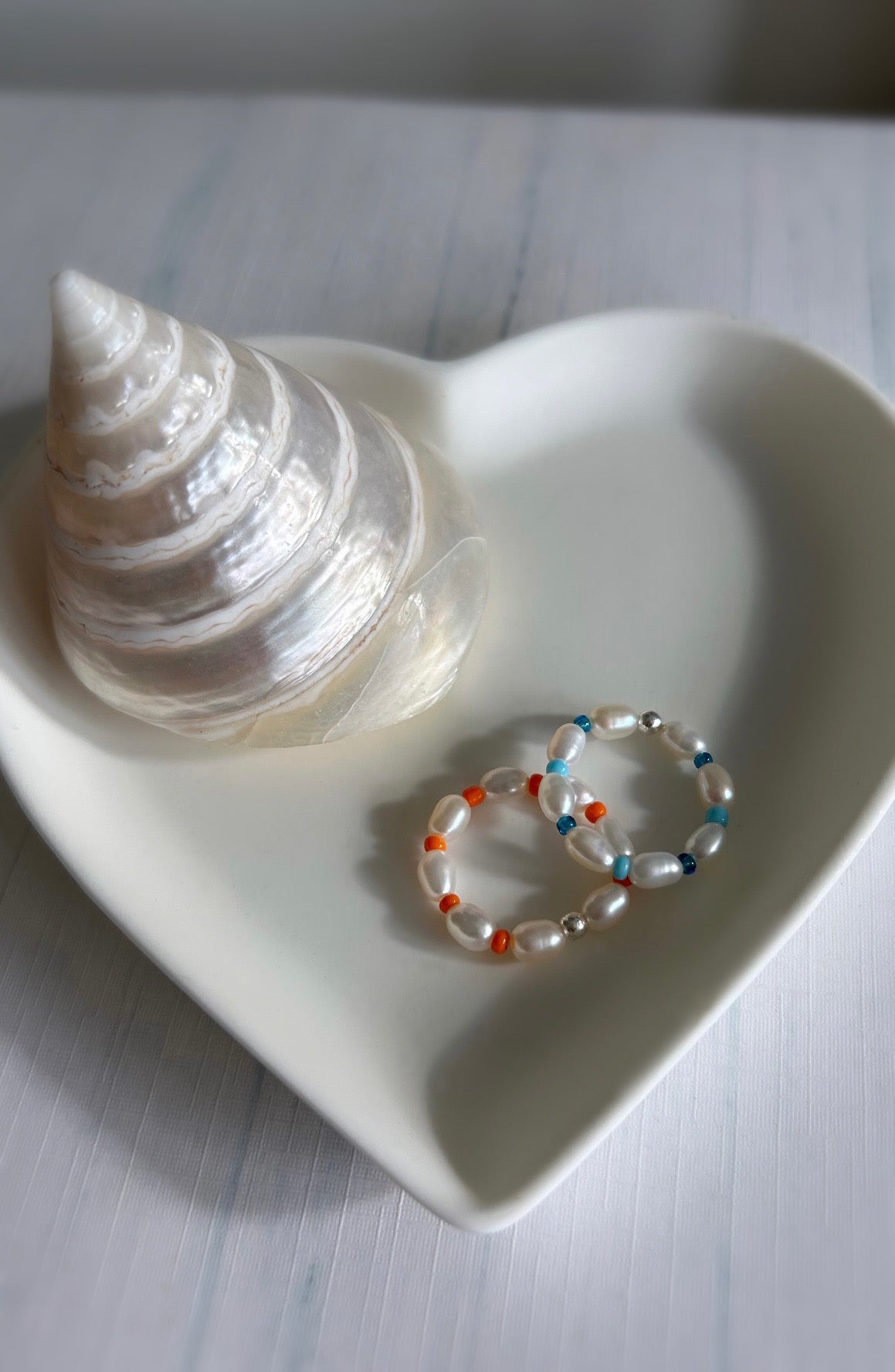 Beautiful Freshwater rice Pearl ring hand threaded on a stretch cord with either a mix of pink, turquoise/blue, or orange glass seed beads & a Sterling Silver spacer bead.