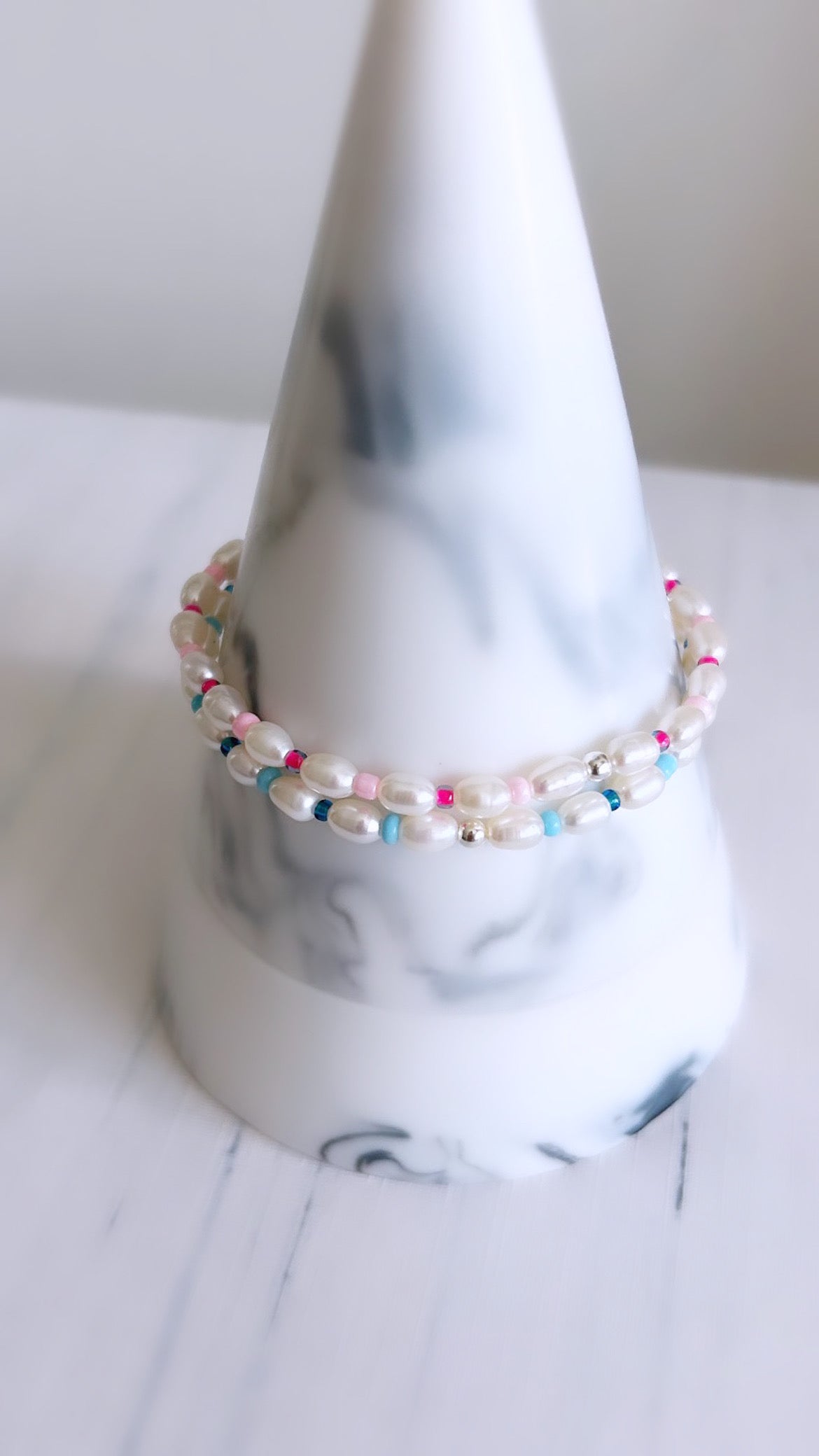 Beautiful Freshwater rice Pearl bracelet with a mix of pink or turquoise/blue colourful glass seed beads spaced throughout the bracelet. Perfect for stacking or for a June birthday gift and also a bridesmaid.
