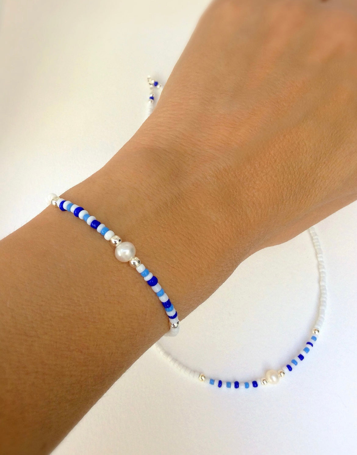 Pretty glass seed bead Bracelet on a stretch cord, in a choice of two colours - Blue or Green. The bracelet has Sterling Silver spacer beads and a central white Freshwater Pearl. Choose from small medium or large.