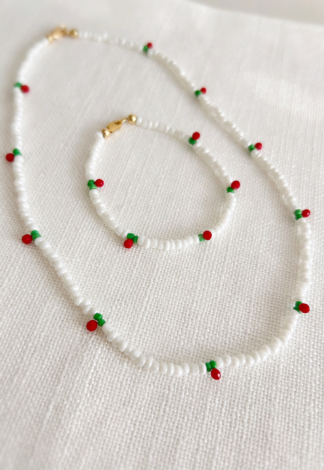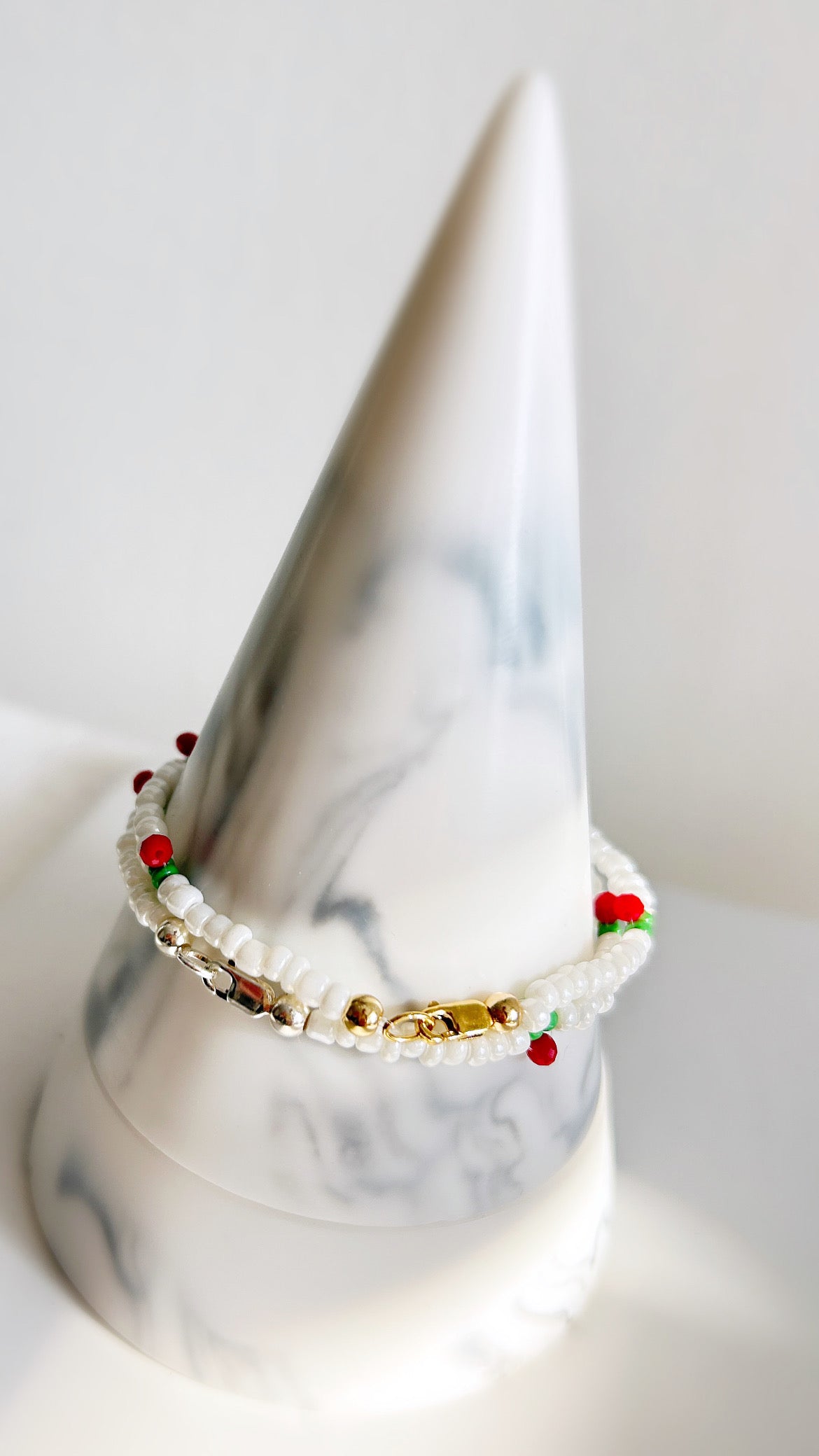 A sweet seed bead Cherry bracelet hand threaded with Miyuki glass and crystal glass faceted beads finished with a choice of a Sterling Silver or Gold Filled clasp.
