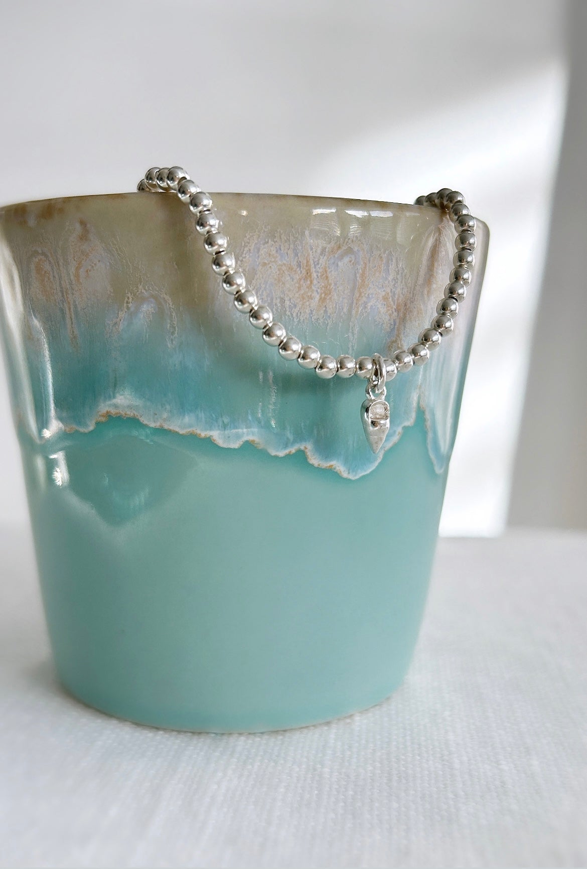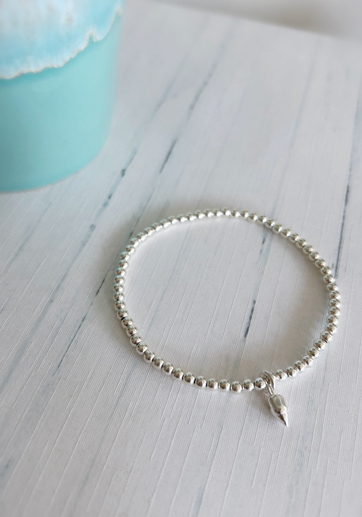 Tiny Shanka conch shell Sterling Silver charm bracelet threaded on a stretch jewellery cord. A beautiful Summer stacking bracelet.
