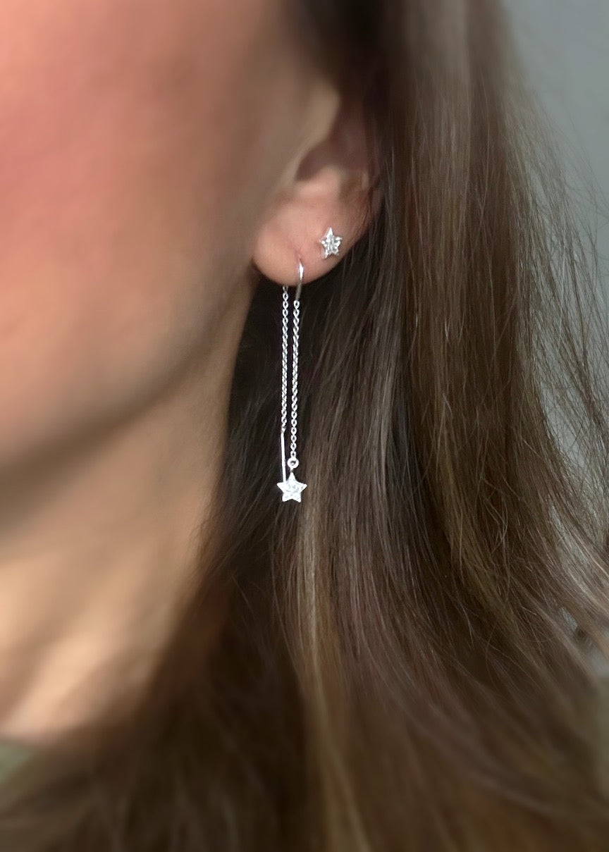 Elegant Sterling Silver threader CZ Star earrings. These beautiful earrings have a Sterling Silver star shaped charm, embossed with Cubic Zirconia with a Sterling Silver trace chain threader fitting. The earrings have a central 'U' shaped half sleeper which fits perfectly within the piercing.