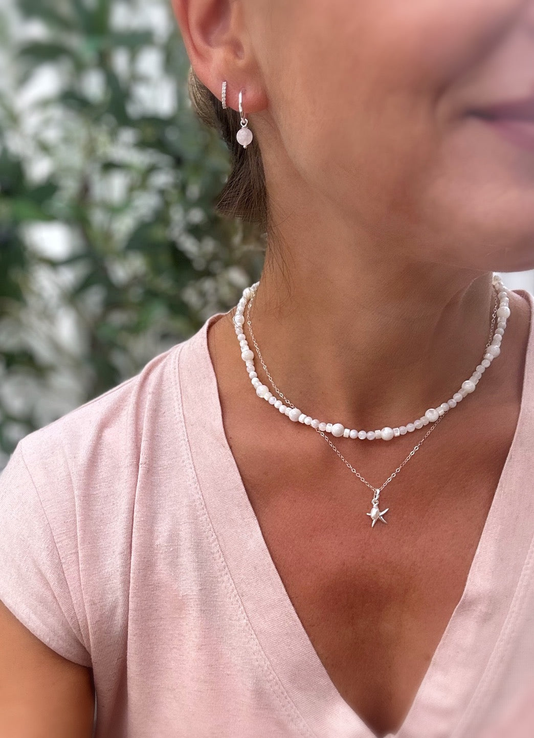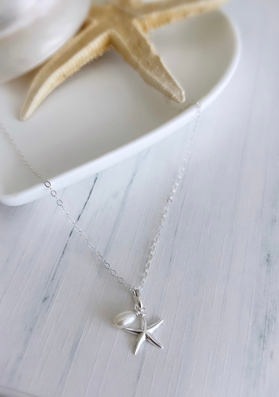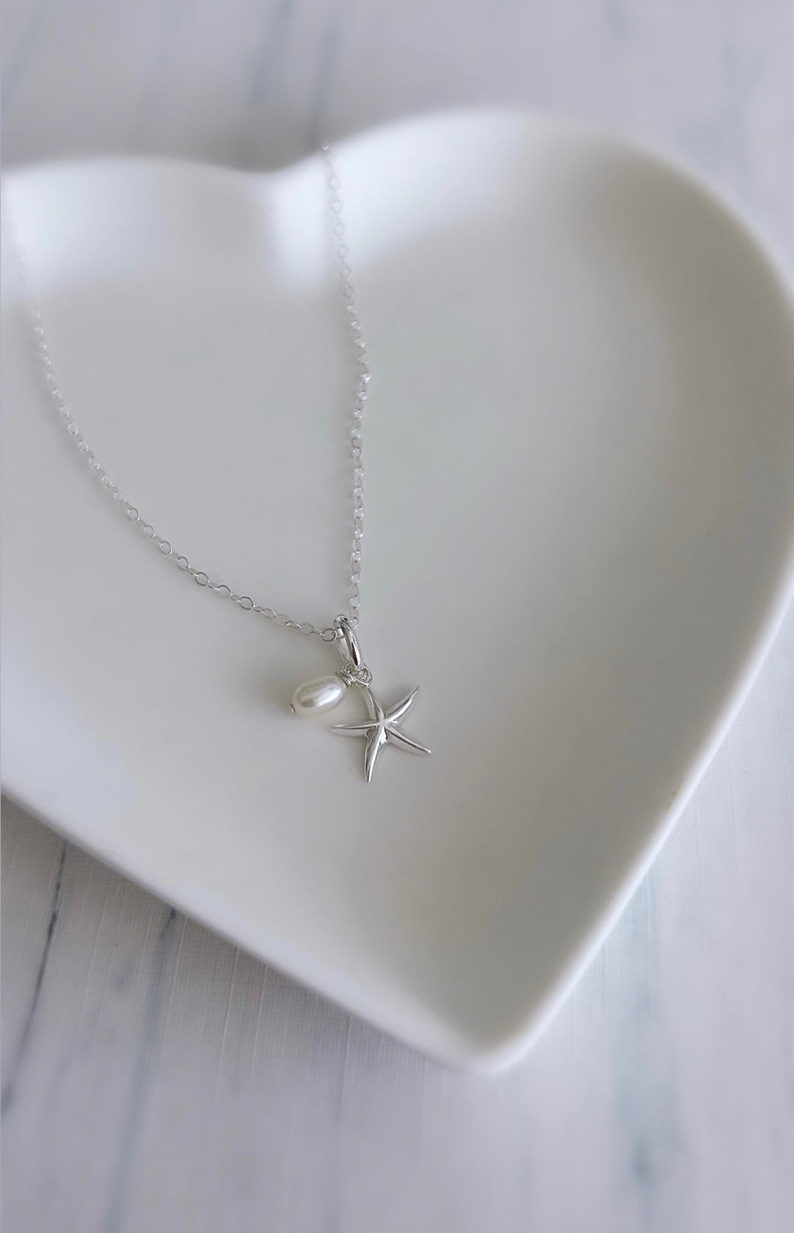 A pretty Silver pendant featuring a Sterling Silver Starfish charm, with a delicate Freshwater Rice Pearl. A beautifully elegant piece of jewellery, which looks perfect layered with a simple strand of pearls.