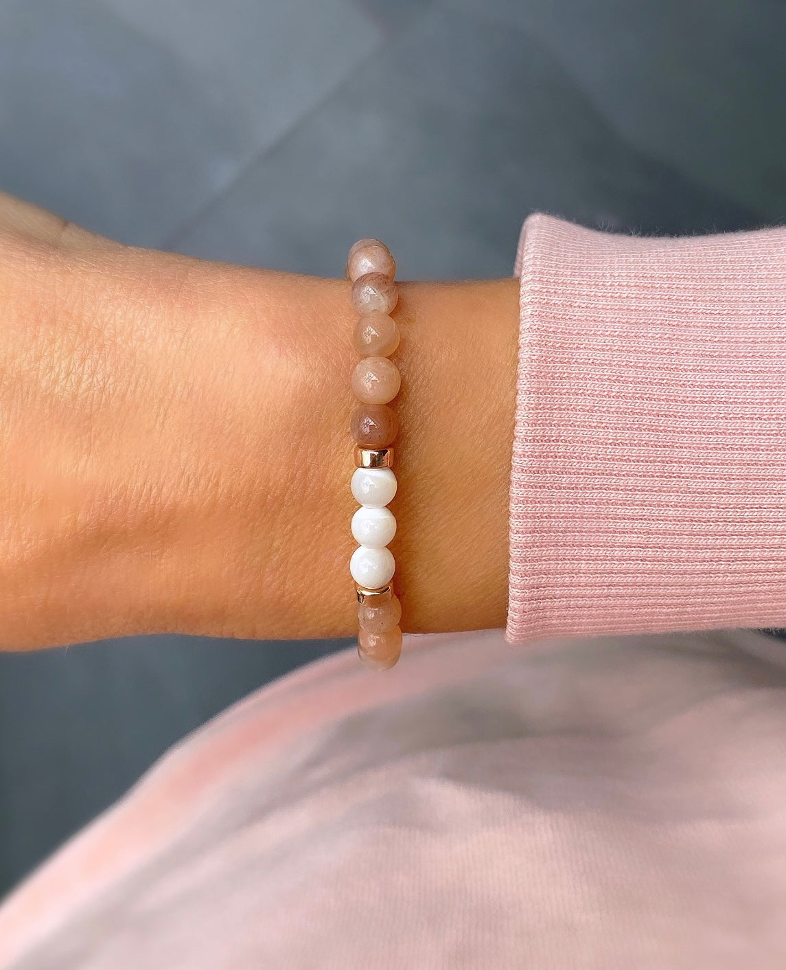 A glorious Sunstone and Mother of Pearl semi precious beaded bracelet, which is finished with either Rose Gold Filled or if you would prefer, Sterling Silver doughnut spacer beads.