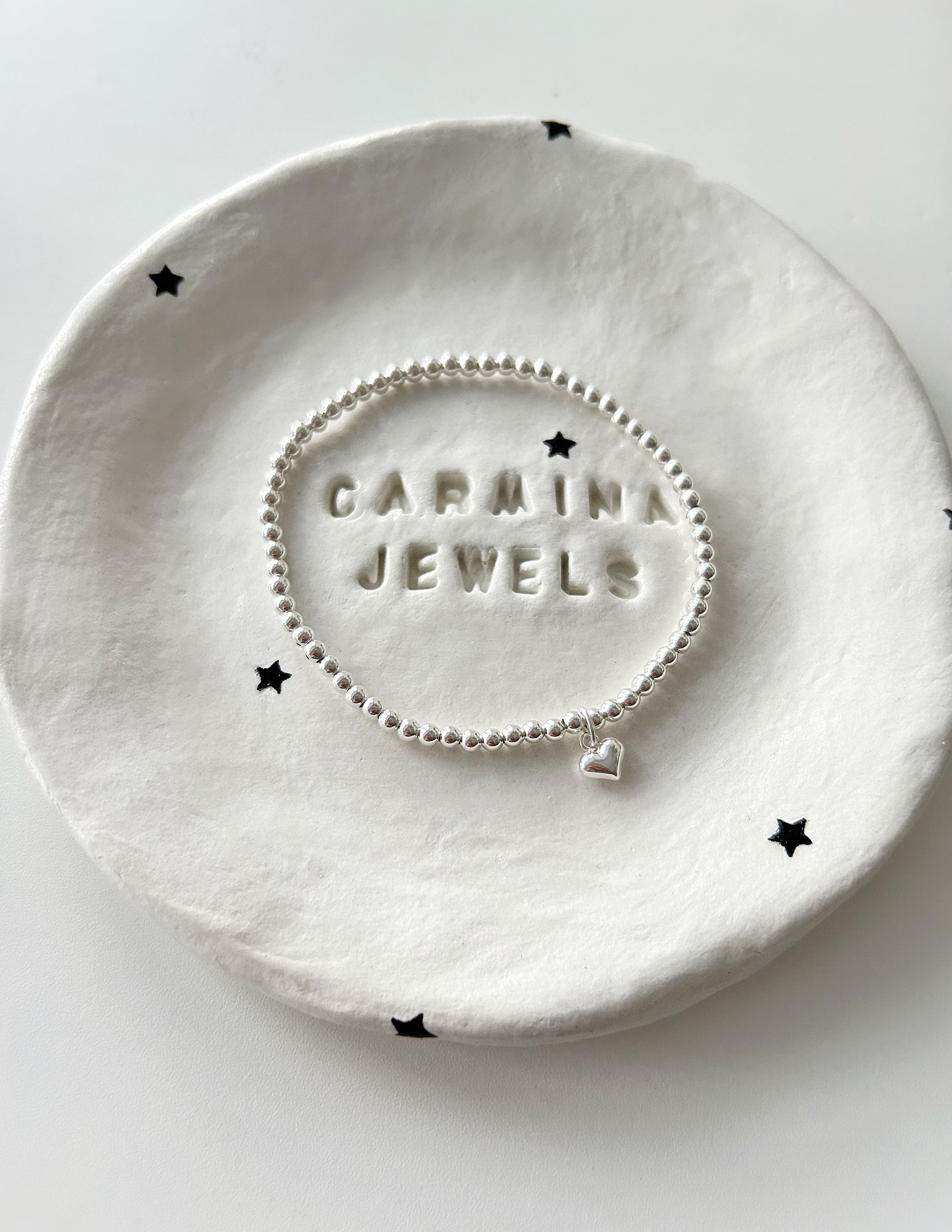 Beautiful Sterling Silver bead bracelet with a tiny puff heart charm. Hand threaded on high quality jewellery elastic for a comfortable stretch fit ~ a perfect Gift for a loved one and a perfect bracelet to stack!