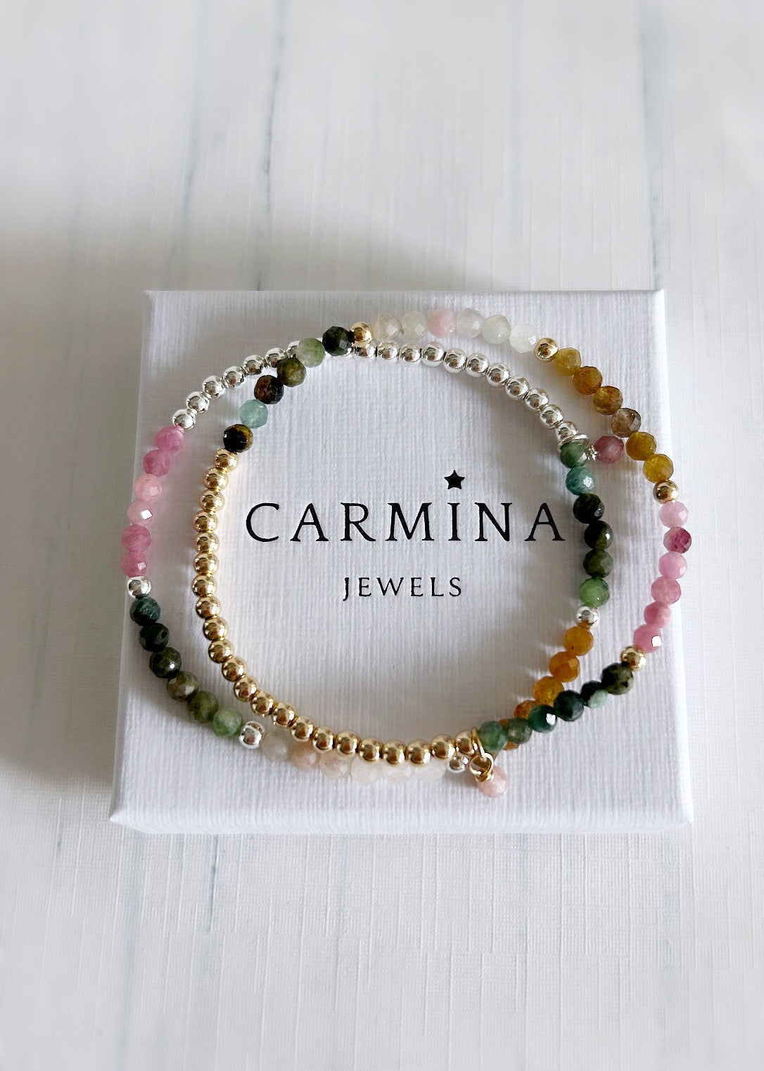 A beautiful sparkling Multi-tourmaline micro-faceted beaded bracelet in a pretty array of colours. In a Sterling Silver or Gold Filled finish, hand threaded on a jewellery stretch cord.