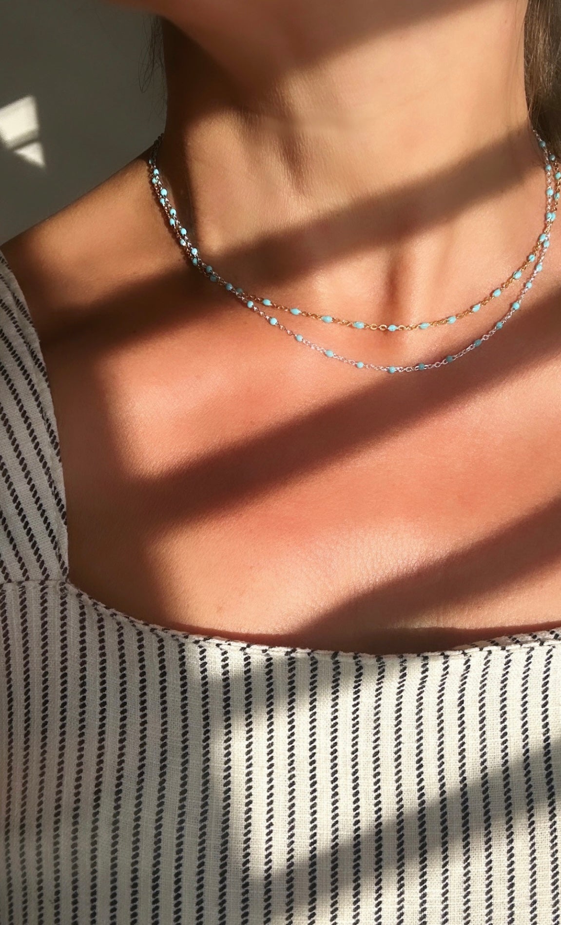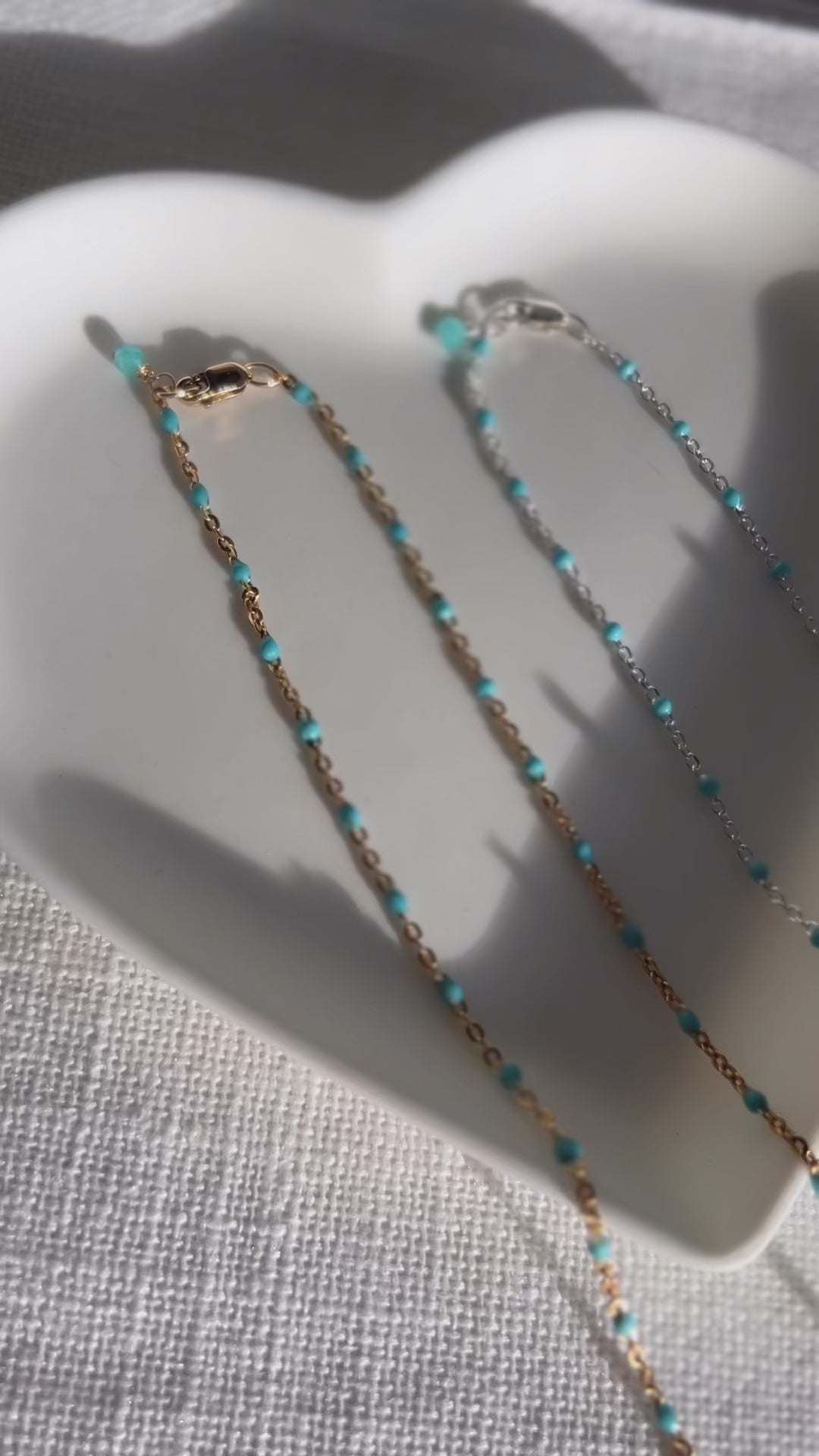 The dainty chain measures 2mm x 1.5mm, and the enamel beads a placed 7mm apart along the chain.