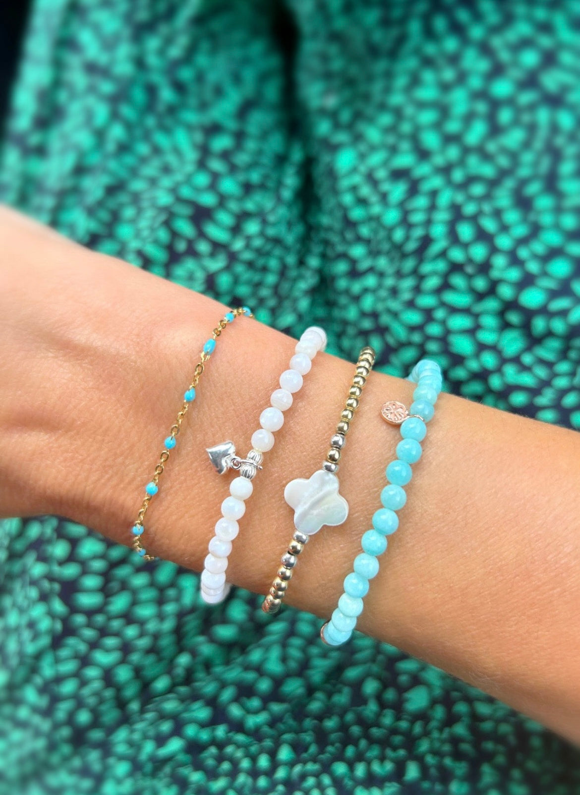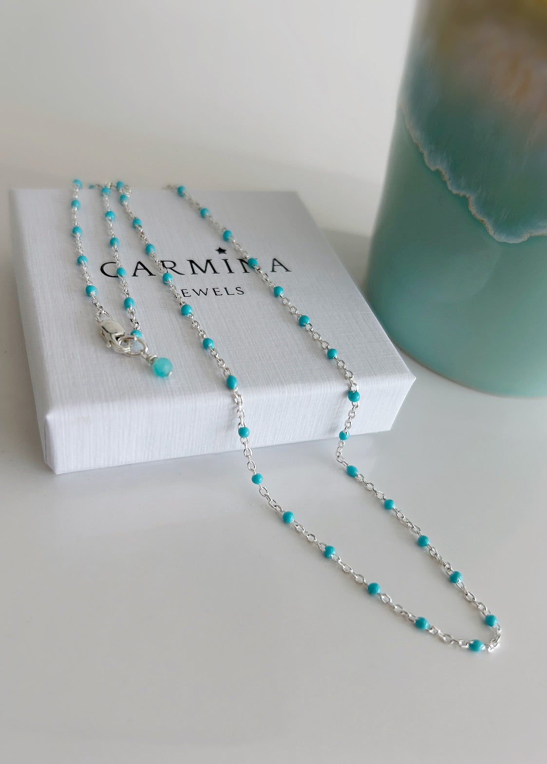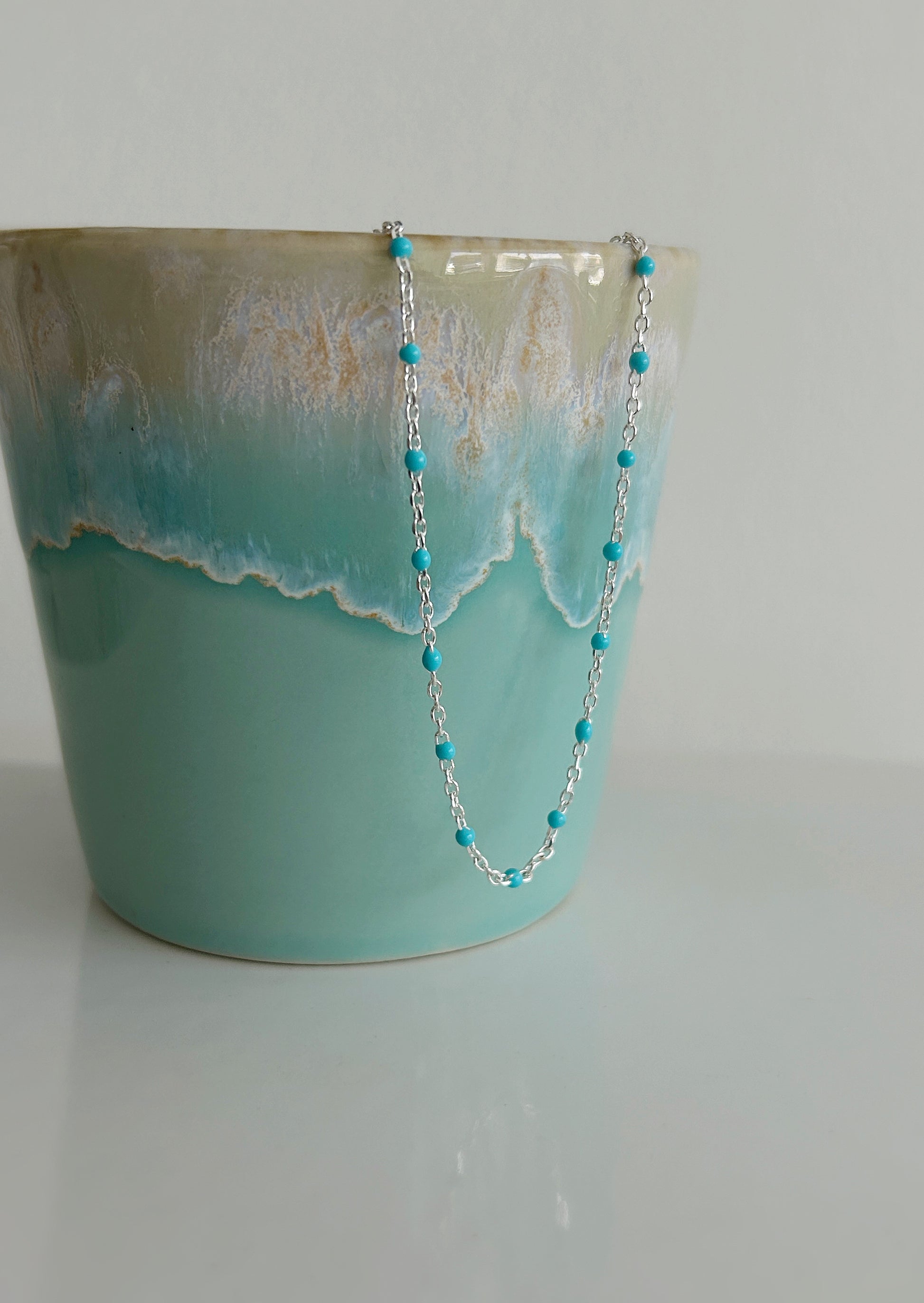 A delicate Gold filled or Sterling Silver flat cable chain necklace dotted with turquoise enamel beads, and finished off with a tiny Amazonite crystal bead at the clasp.