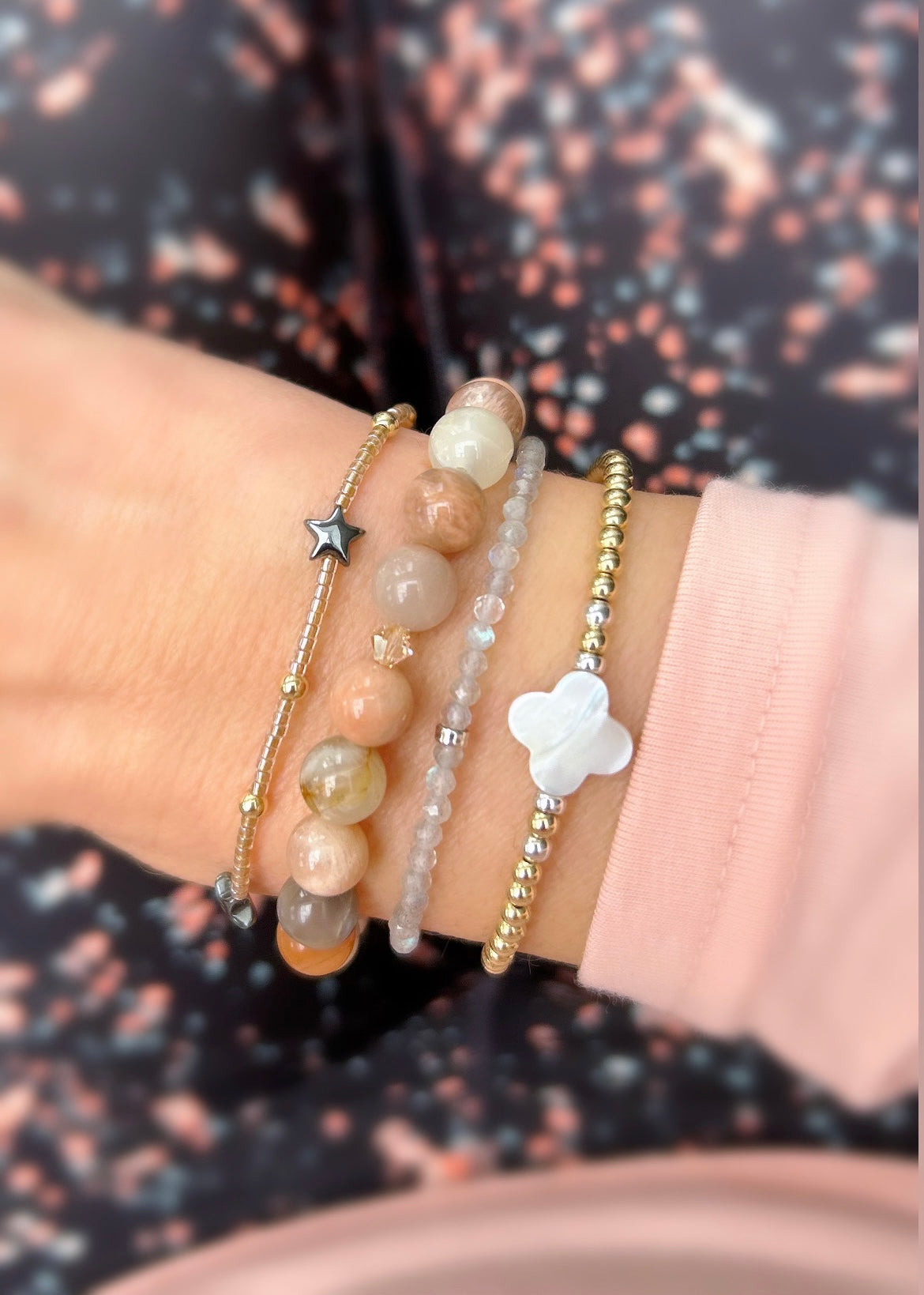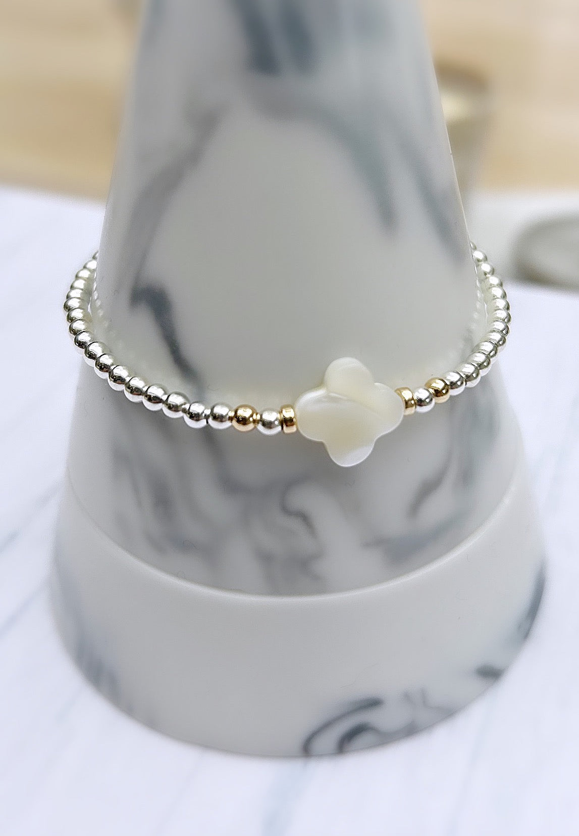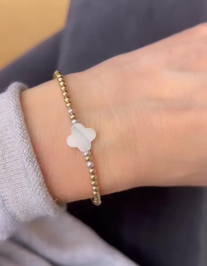 A beautiful beaded stacking bracelet with a central Mother of Pearl clover bead, hand threaded on high quality jewellery elastic for a comfortable stretch fit. Available in either Gold filled or Sterling Silver.
