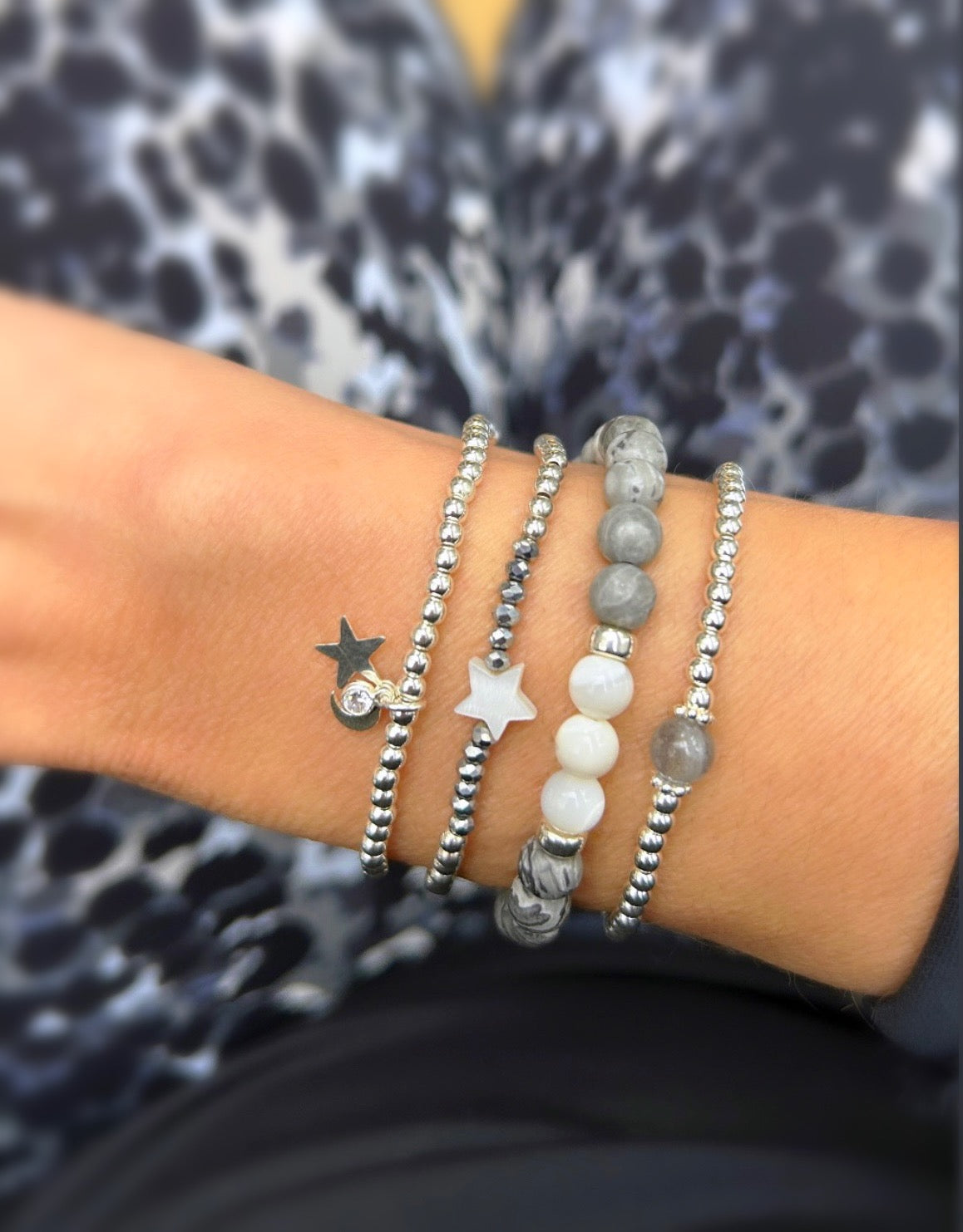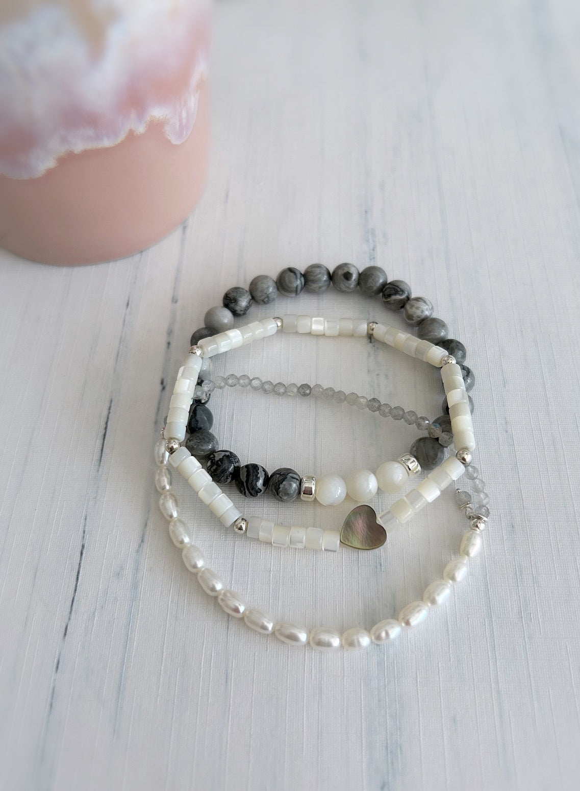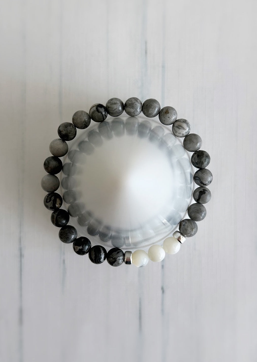 A gorgeous Grey Scenery Jasper and Mother of Pearl semi precious beaded bracelet, which is finished with Sterling Silver doughnut spacer beads.