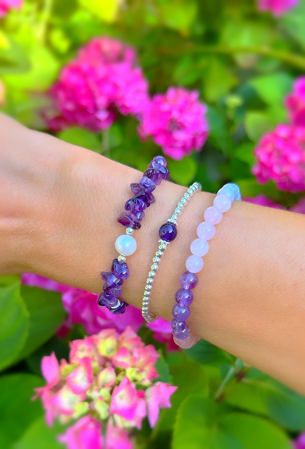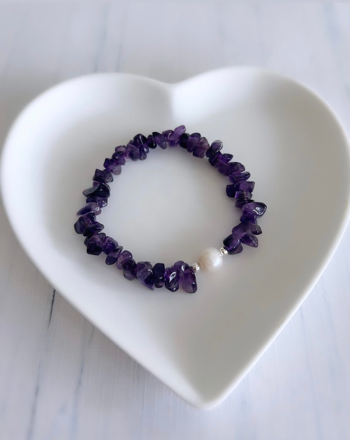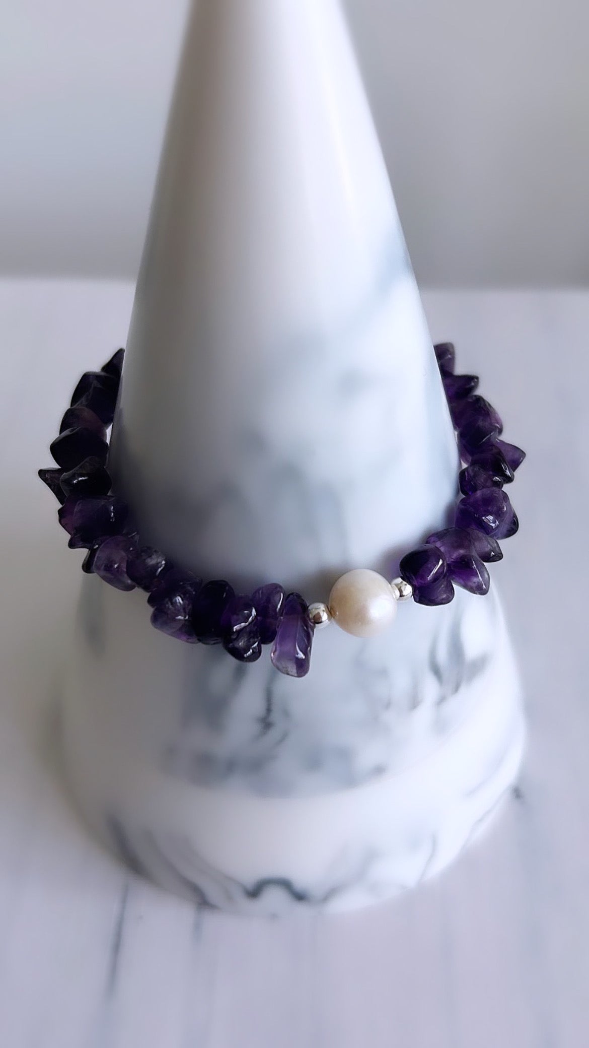 Pretty Amethyst gemstone cluster beaded bracelet with a single freshwater pearl. The Small Bracelet measures approx 16.5cm /Medium 18cm / Large 20cm.