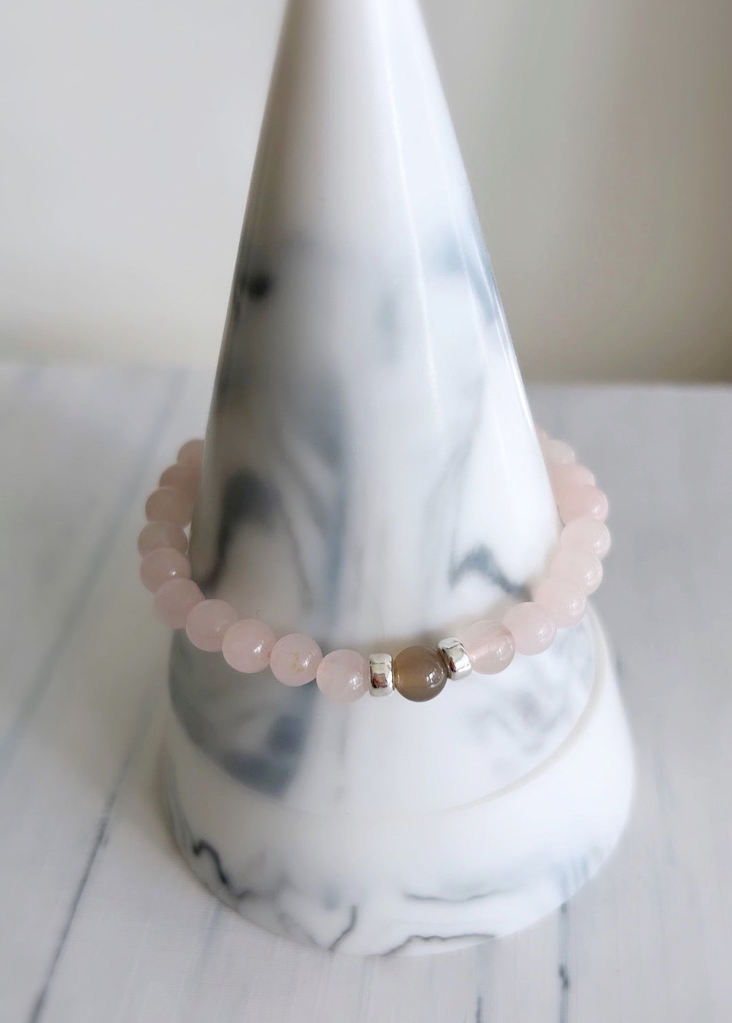Beautiful Rose Quartz gemstone beaded bracelet on a stretch cord, with a single Grey Agate central bead set between Sterling Silver doughnut spacer beads.
