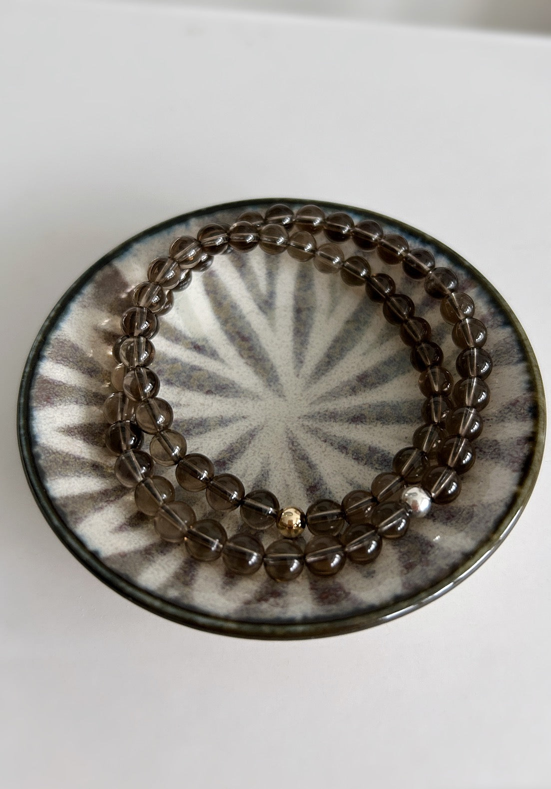 Gorgeous Smoky Quartz beaded bracelet with a Sterling Silver or Gold Filled spacer bead hand threaded on a stretch cord.