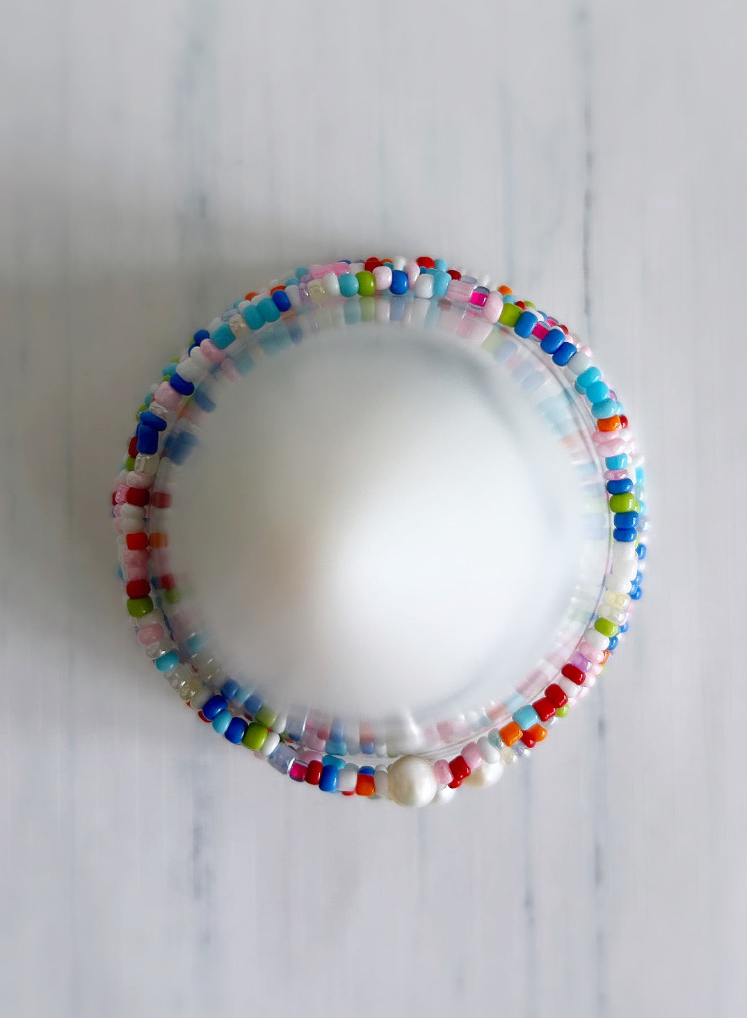 Colourful mixed glass seed bead ‘summer vibes’ bracelet or anklet on a flexible stretch cord, with a central white freshwater pearl. Choose from small medium, or large.